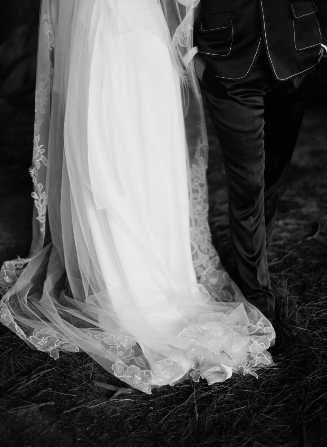 Polly finished her look with our Prim Lace Veil, a light and understated bridal veil that moved softly in the alpine air. Its delicate lace detail complemented the simplicity of the Sadie Silk Set without overpowering it, a timeless finishing touch for a modern wedding day.