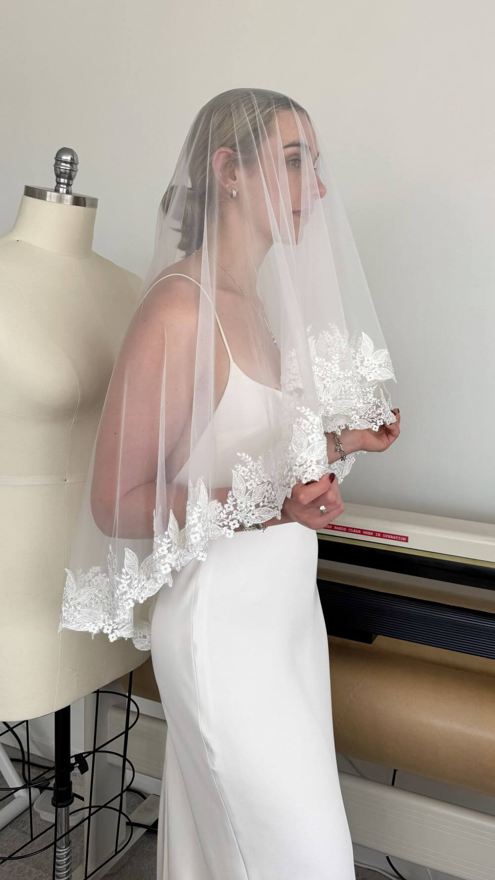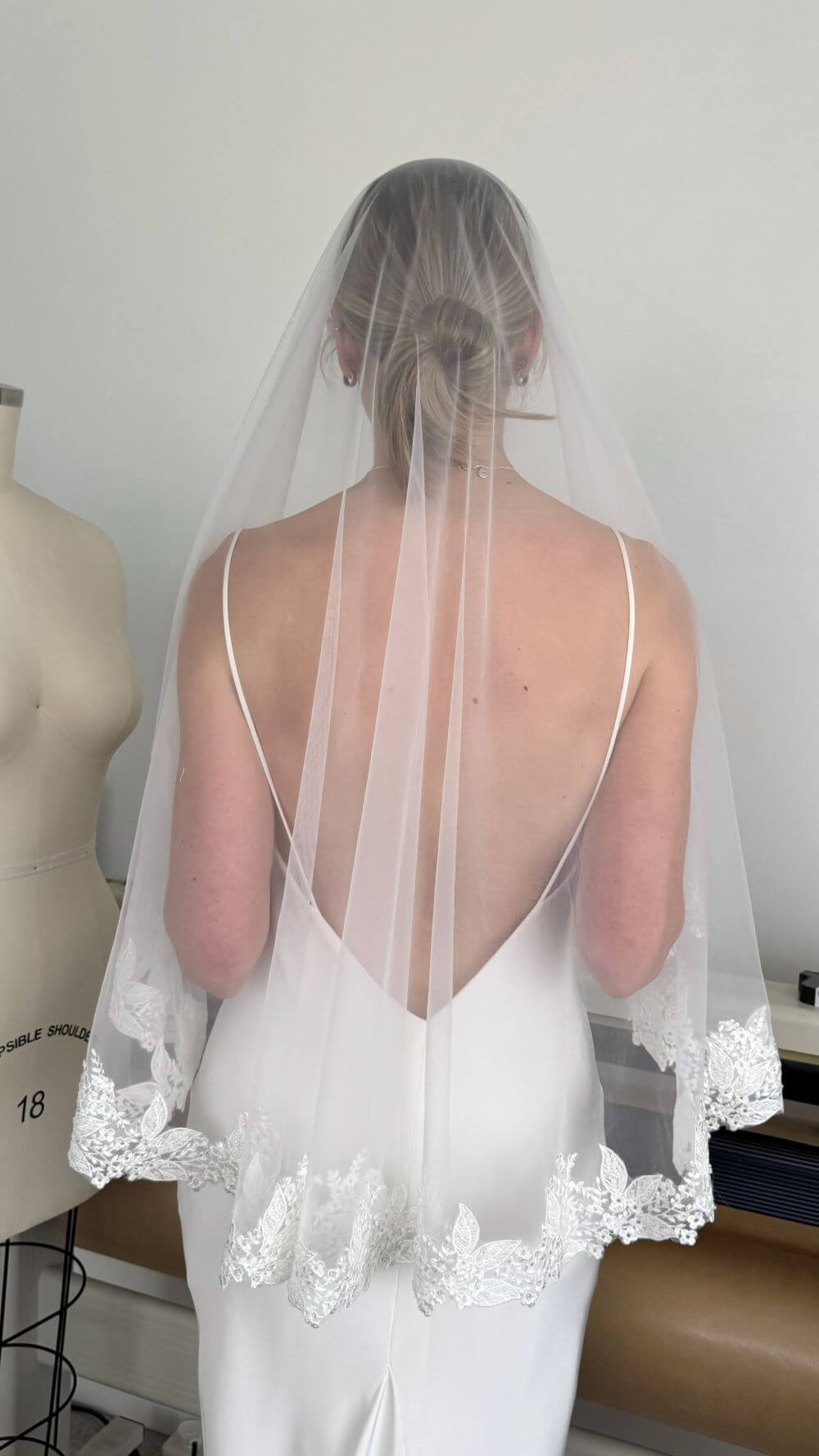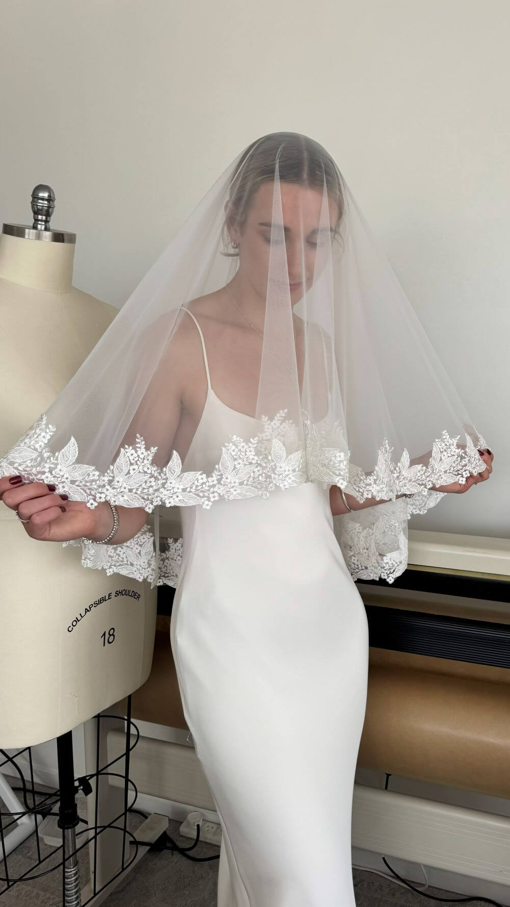 The Mini version of our Avani veil. Soft ivory mini veil with leaf beaded lace edge. The hair comb can be placed at a custom length to wear as a single-layer veil or as a blusher over the face. Made from soft off-white tulle with beaded lace trim, this versatile mini veil offers elegant style in a shorter, wearable length.