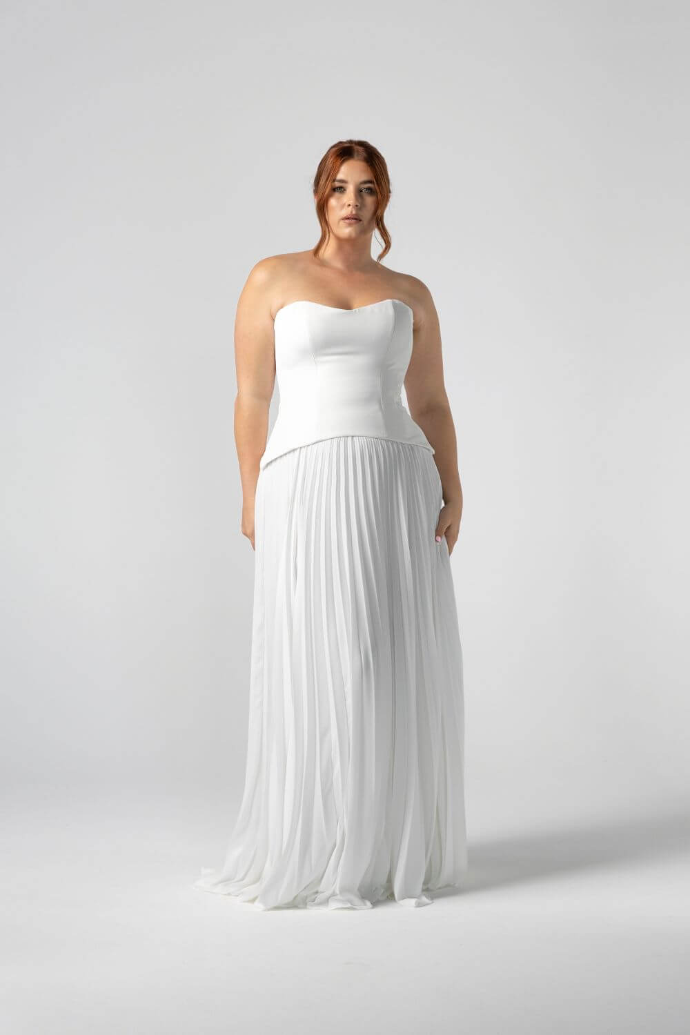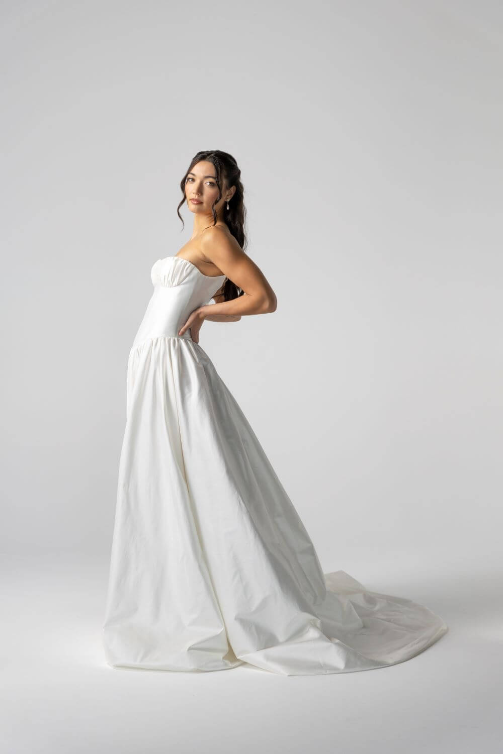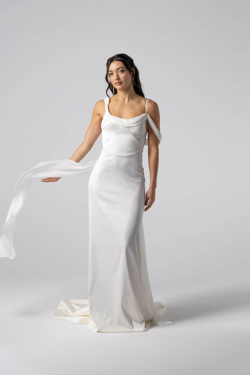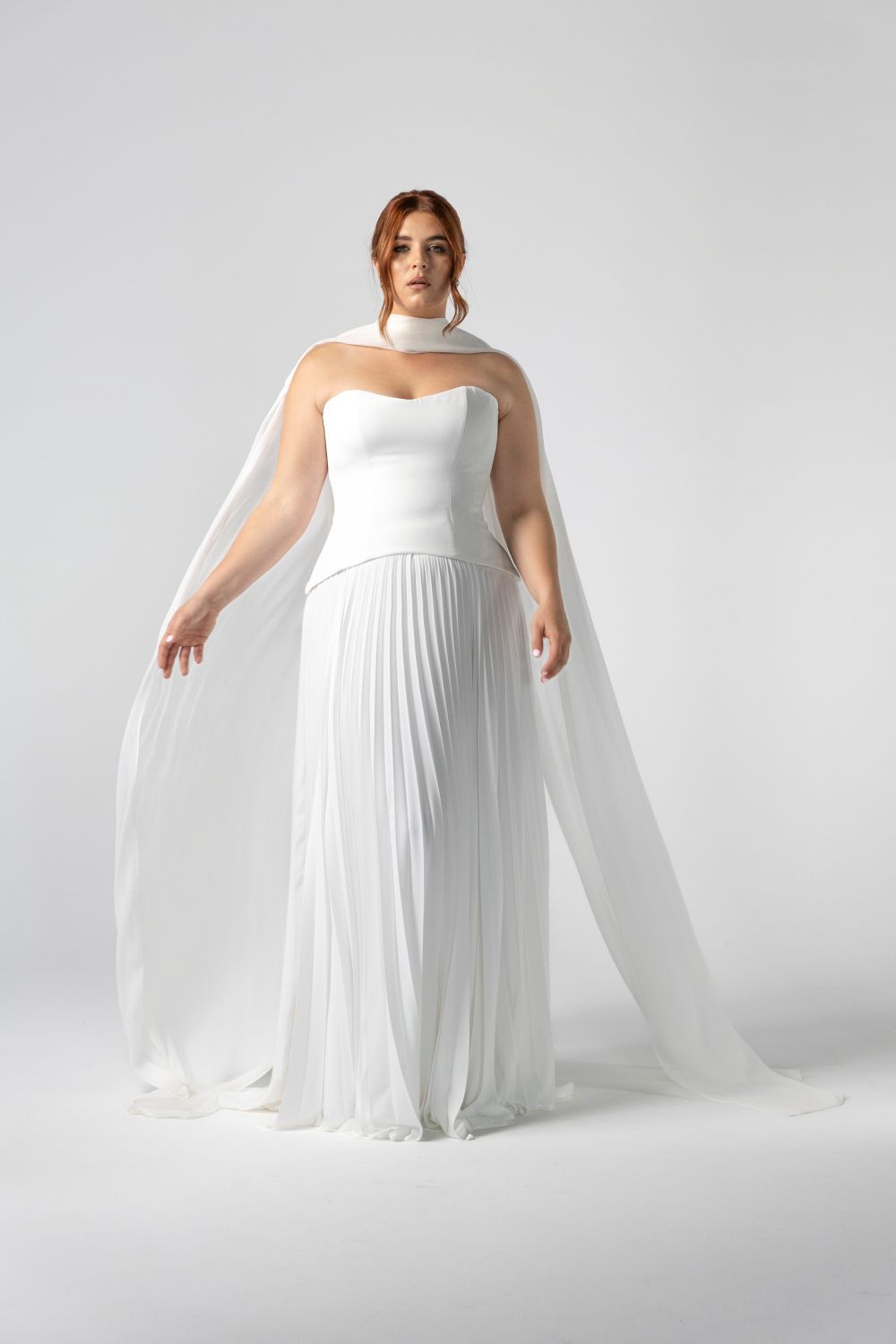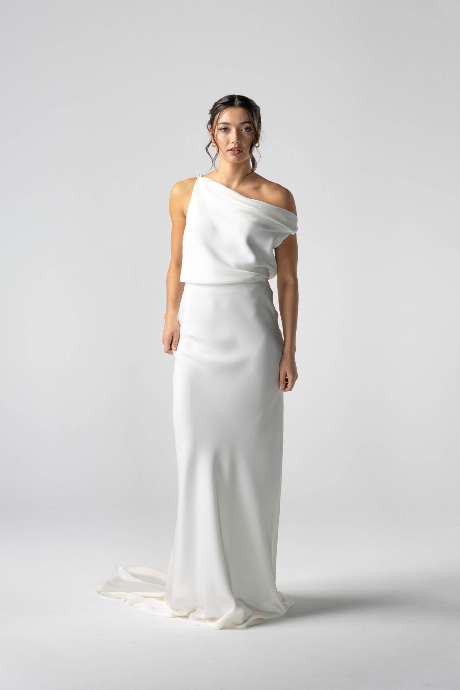 A modern bridal collection of wedding dresses, separates, and accessories designed for ease, movement, and understated elegance. Old Hollywood glamour meets modern minimalism in refined silhouettes, vintage charm, and soft drama, made for the modern wedding aisle.