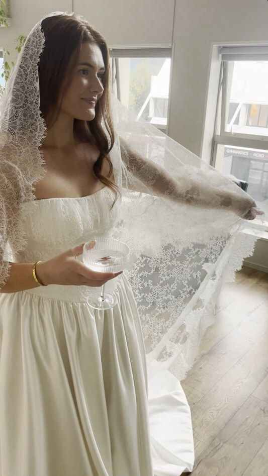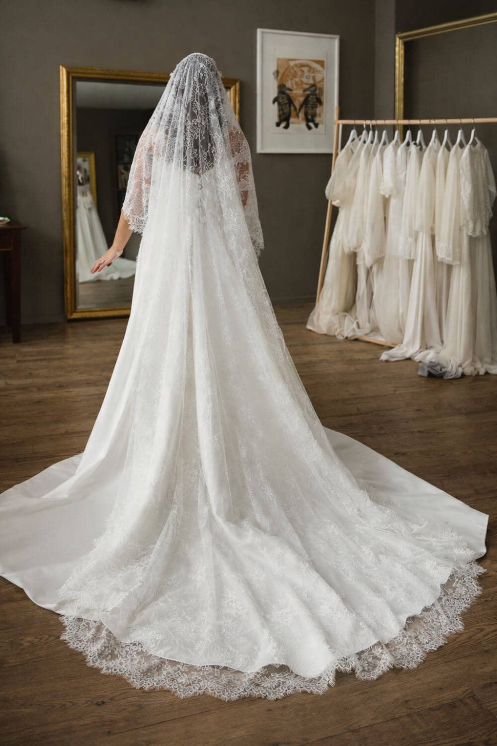 This elegant Chantilly lace wedding veil features intricate all-over lace with a delicate lace edge for a soft, romantic finish. Lightweight and timeless, it drapes beautifully to complement both classic and modern bridal gowns. A refined statement piece for brides seeking effortless elegance.