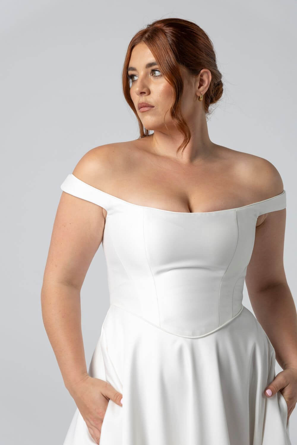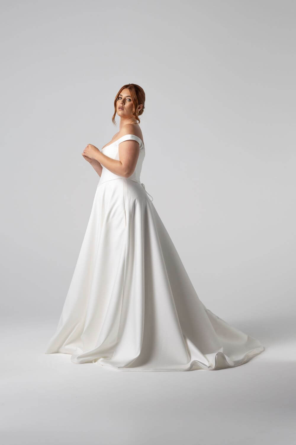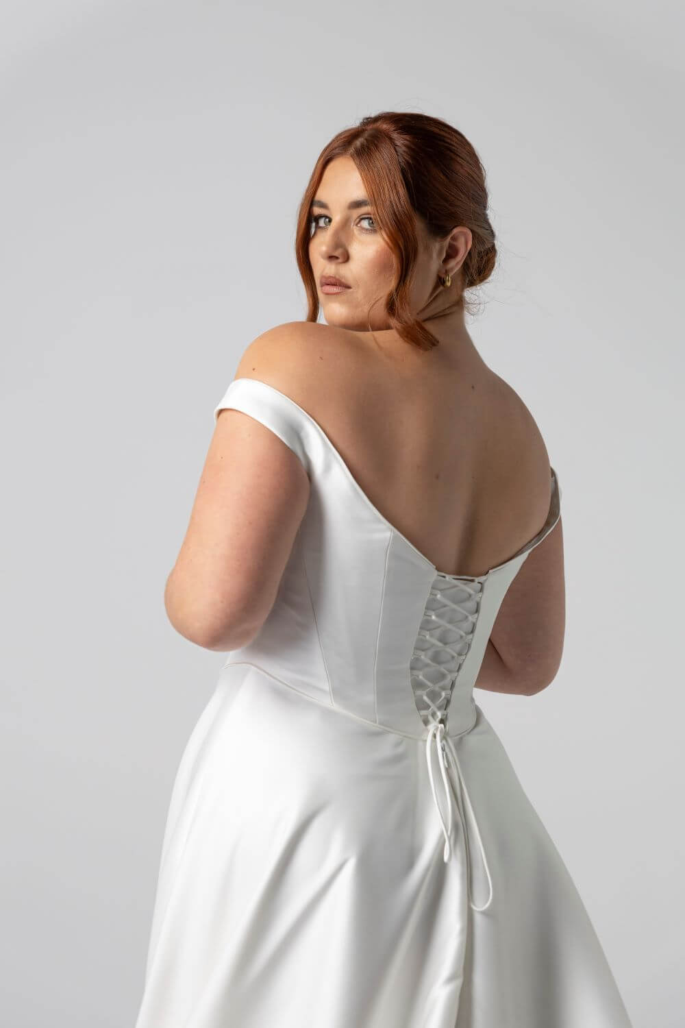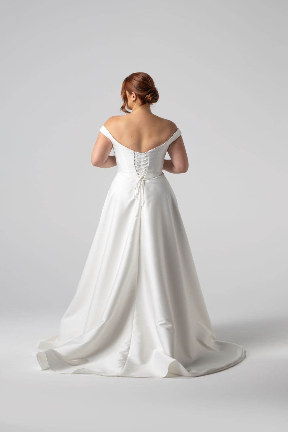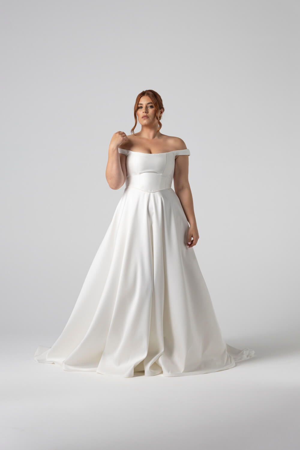 Claudette balances clean architectural lines with intricate detailing, featuring piping along the neckline and waist. Its sculpted off-the-shoulder corset and Mikado A-line skirt create a structured silhouette with a lace-up back for flawless, custom fit.