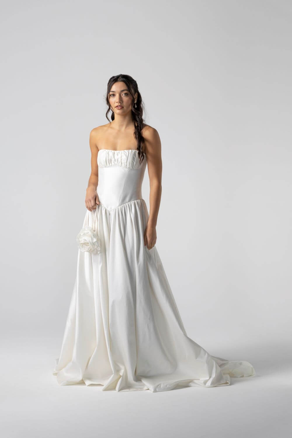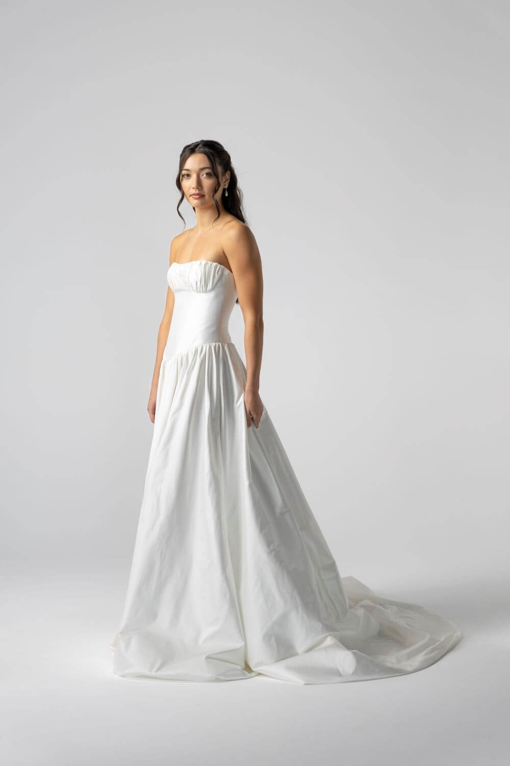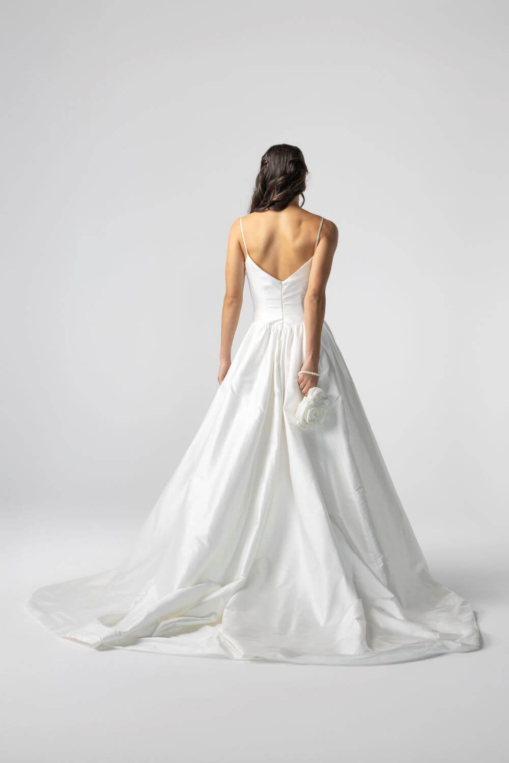 The Davis Gown features a sculpted basque waist corset and a lightweight, voluminous skirt cut from structured silk dupion. With the option of fine spaghetti straps or a clean strapless finish, it blends vintage charm with modern ease, making it perfect for a garden ceremony, chapel aisle, or heritage setting.