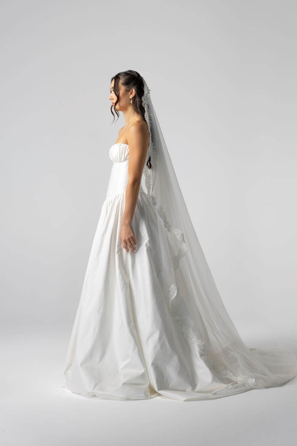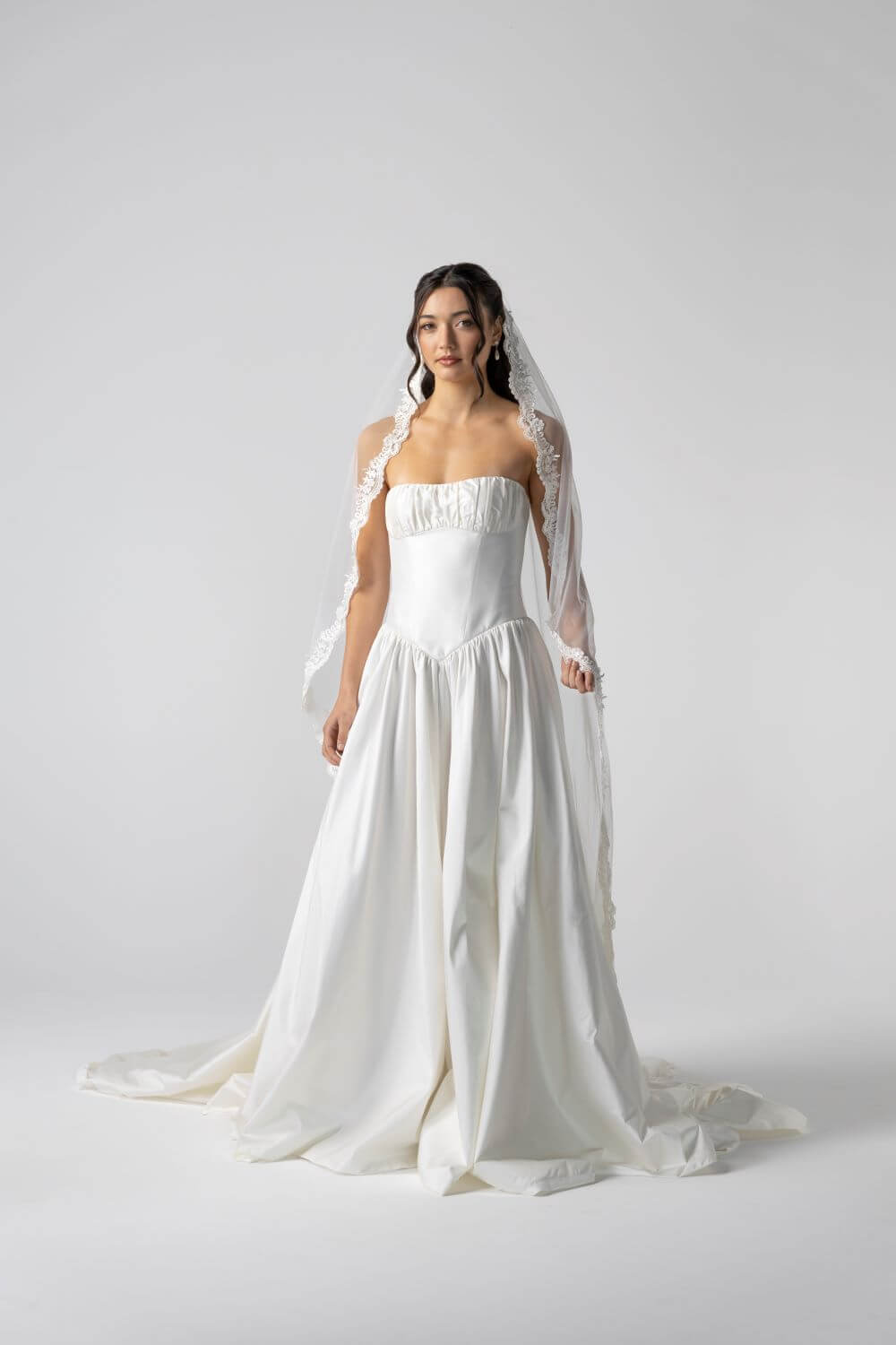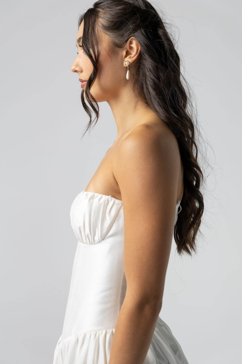 The Davis Gown features a sculpted basque waist corset and a lightweight, voluminous skirt cut from structured silk dupion. With the option of fine spaghetti straps or a clean strapless finish, it blends vintage charm with modern ease, making it perfect for a garden ceremony, chapel aisle, or heritage setting.