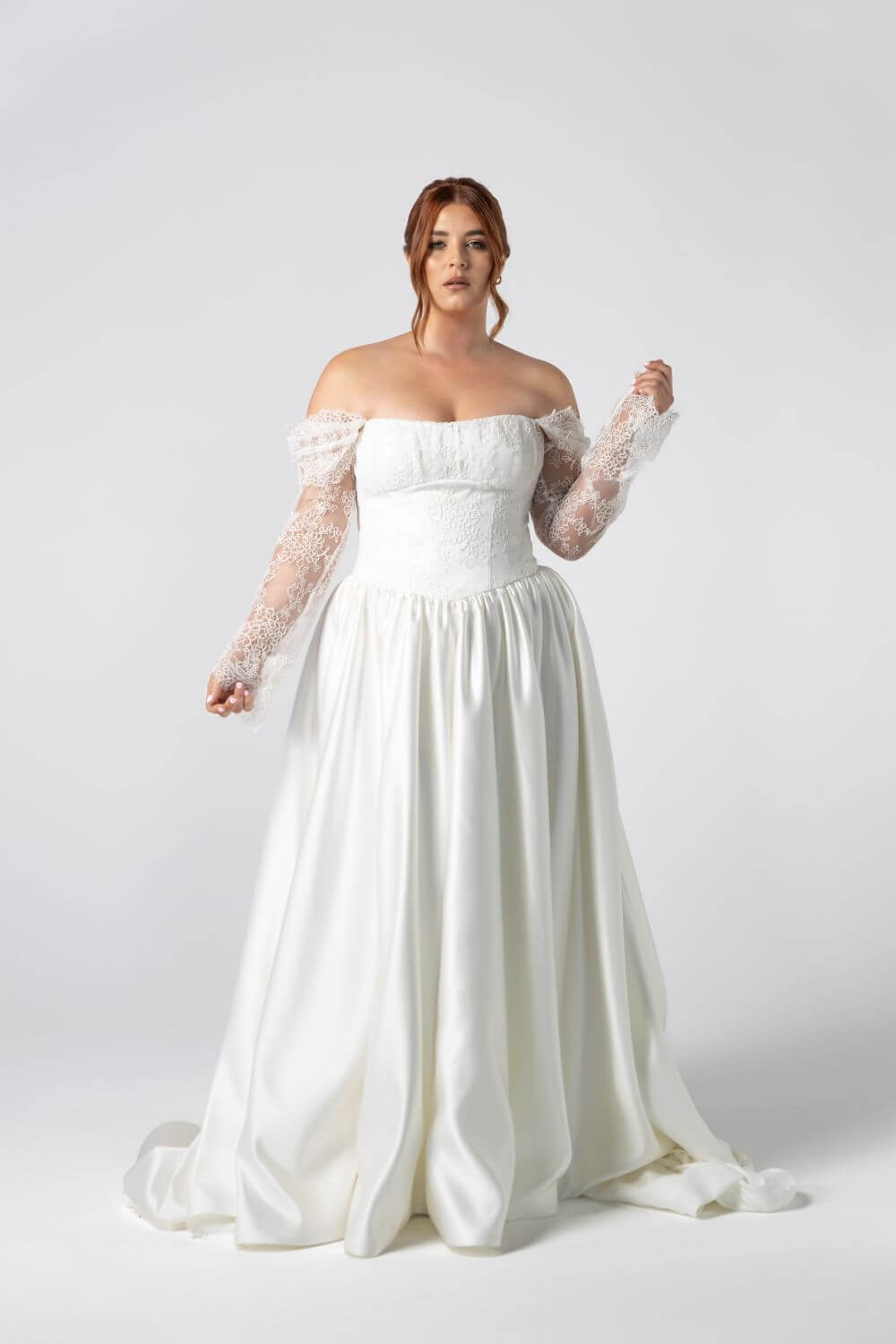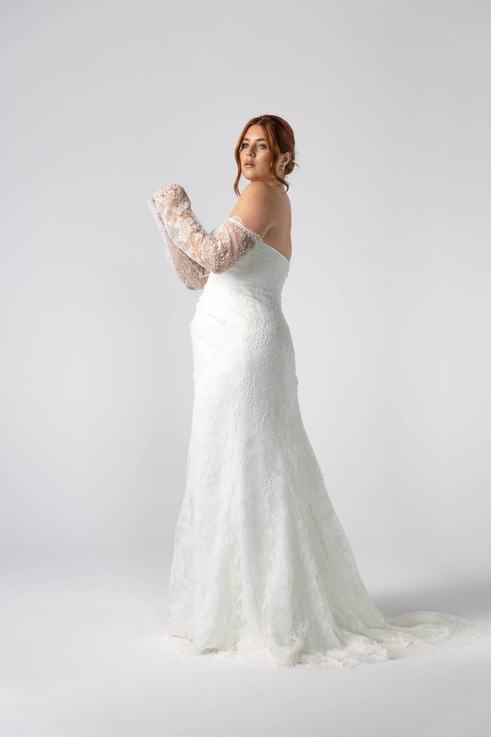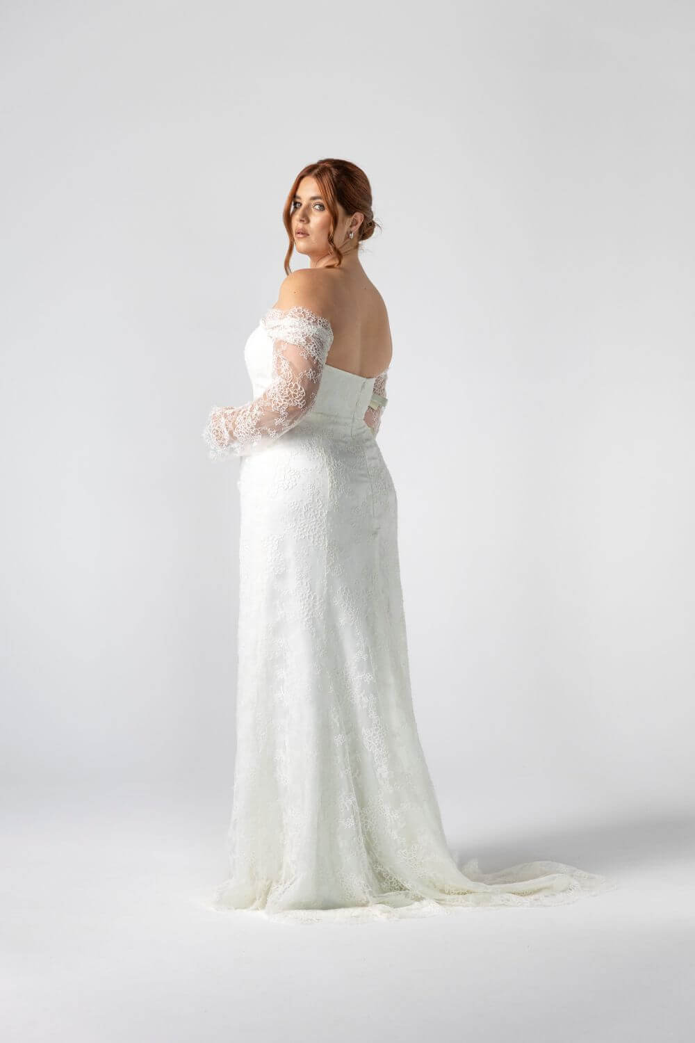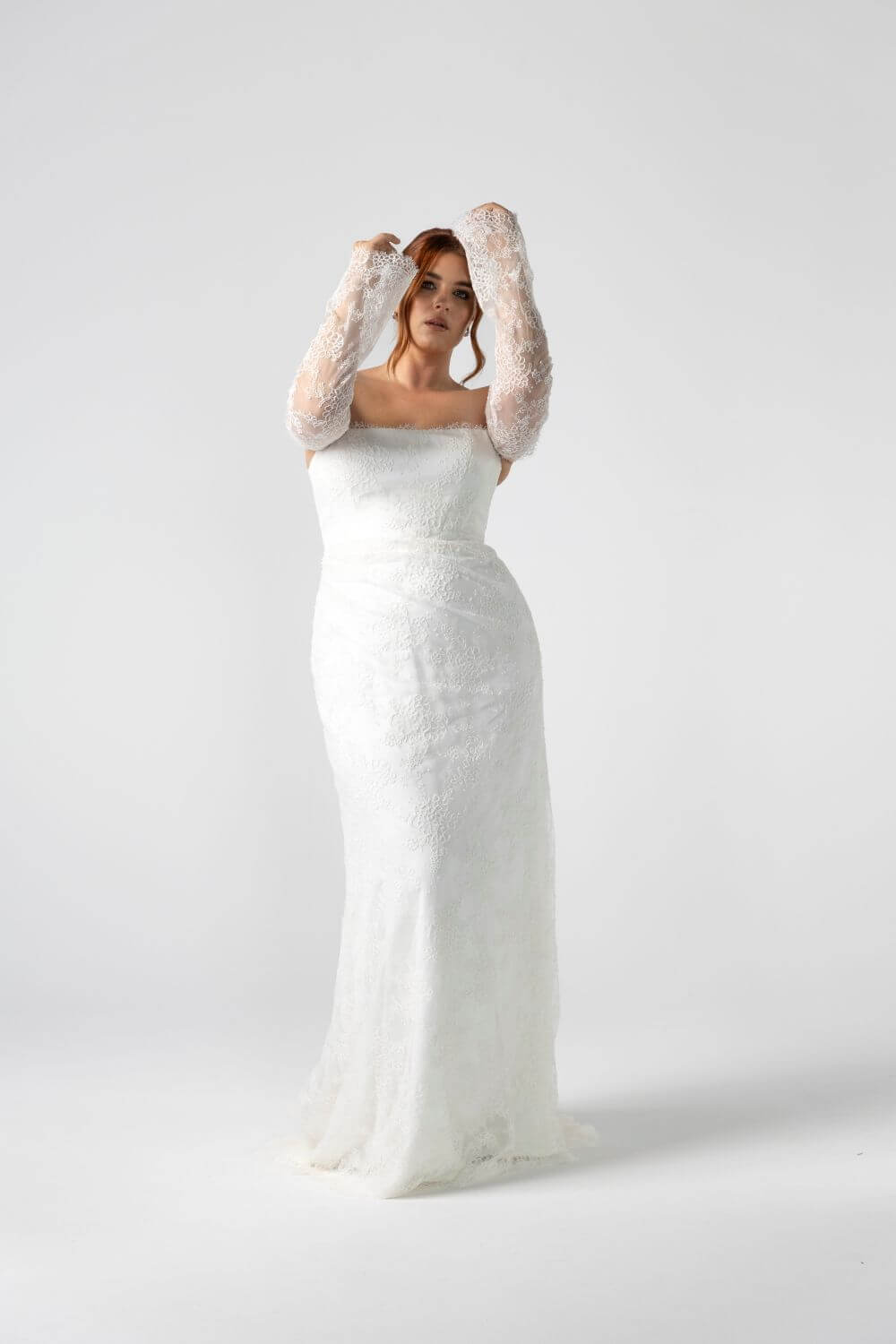 Light and delicate corded lace sleeves designed to elevate and transform your bridal look. These detachable gloves are the perfect accessory to soften a structured gown or add romance to minimal silhouettes. Styled with the Clara Gown and Vivian