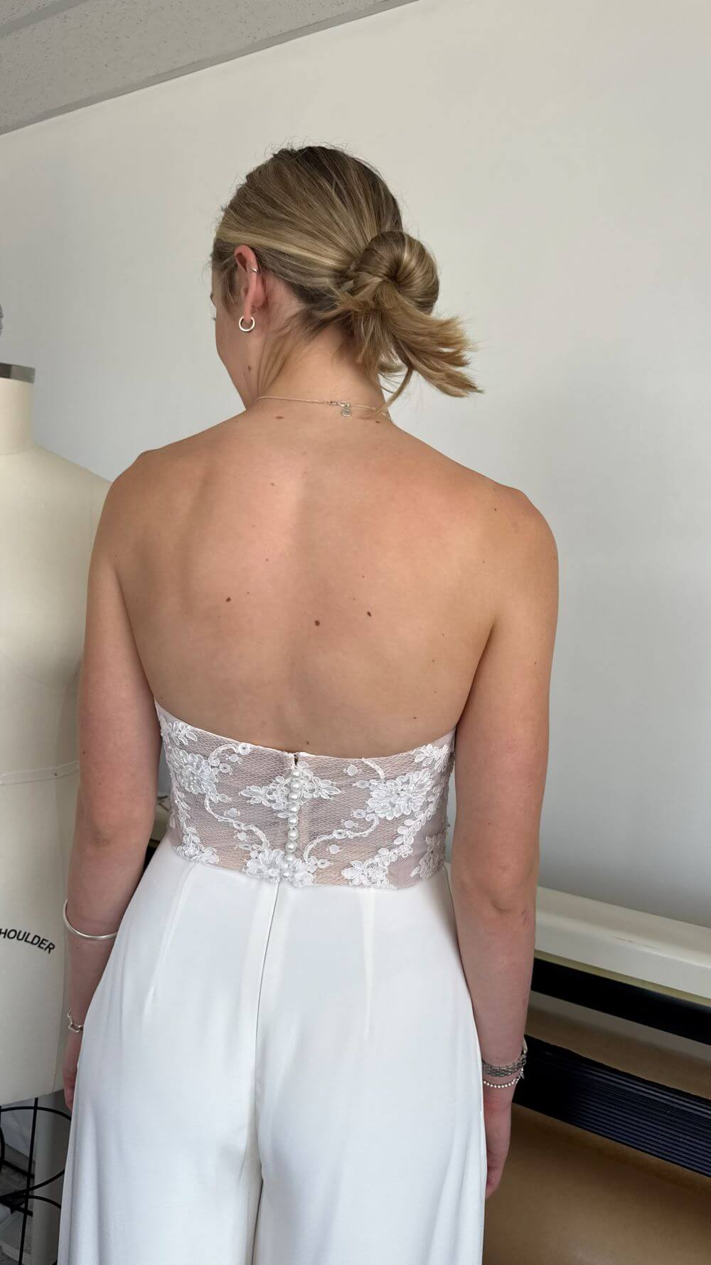 This Beaded Corded Lace Bustier a versatile bridal piece, perfect with silk crepe pants for a rehearsal dinner , the Sadie skirt for the ceremony, or a mini skirt for the reception. Featuring a skin-tone lining and pearl button back, it adds timeless elegance to every wedding moment.
