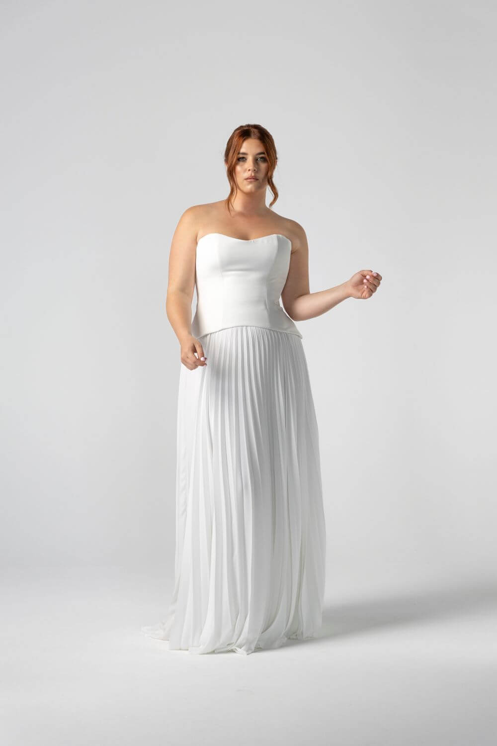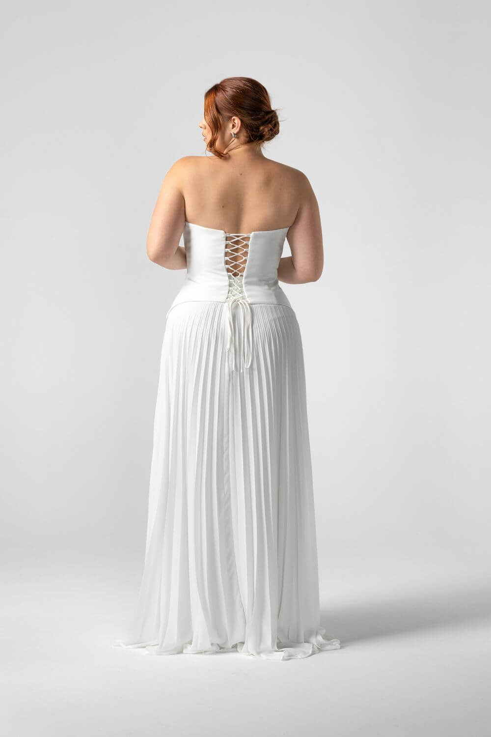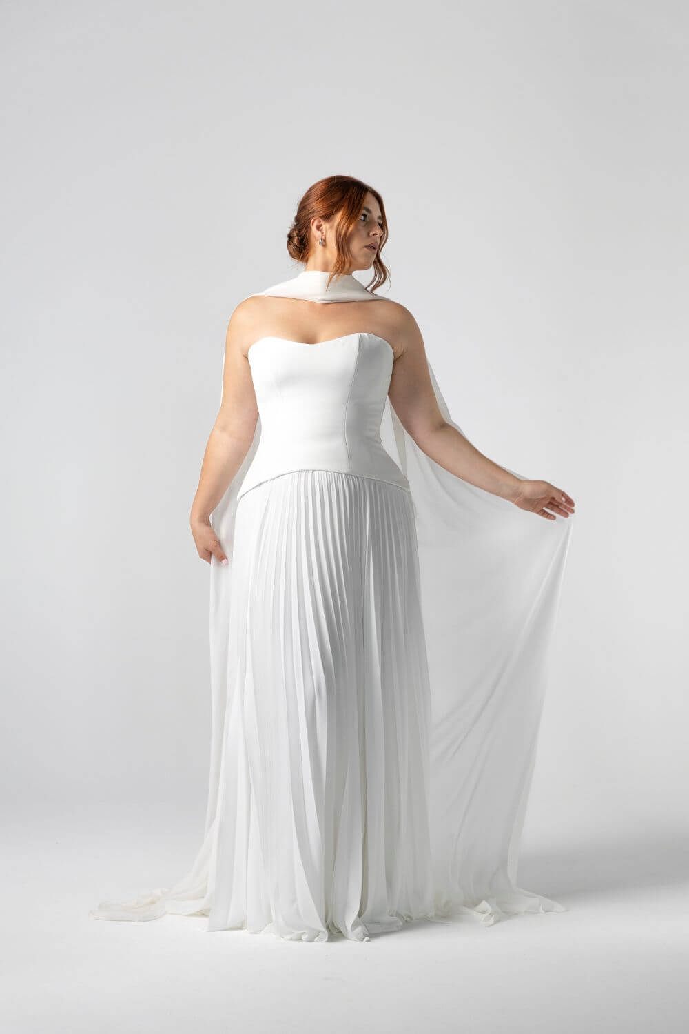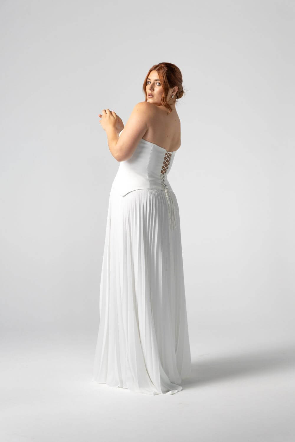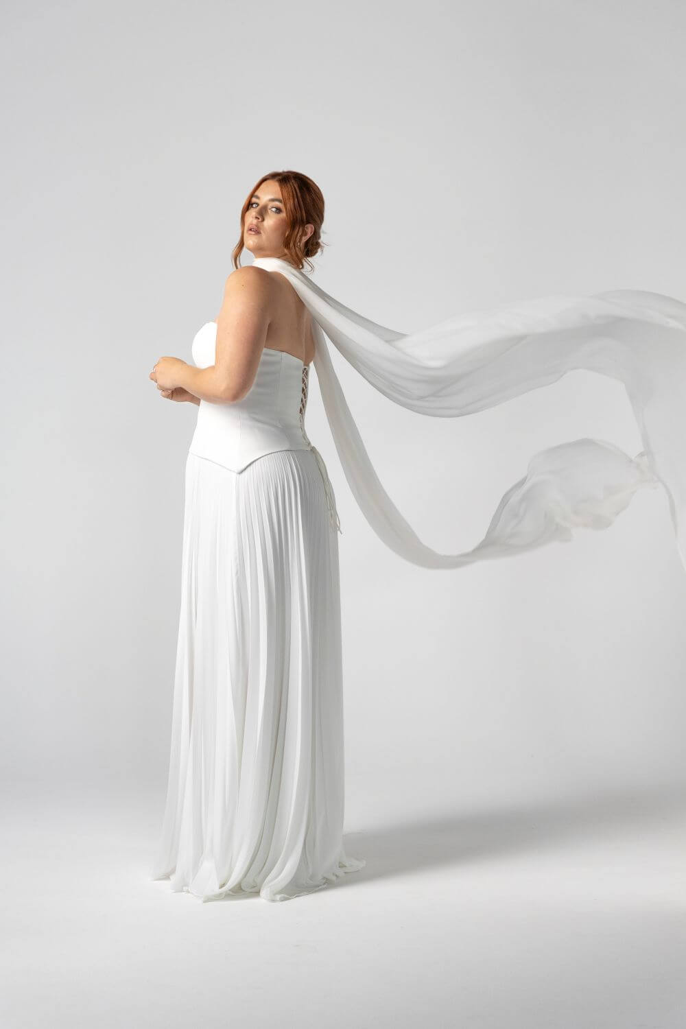 Light, pleated chiffon makes the Monroe Skirt endlessly fun to wear — floaty, flattering, and full of movement. Styled here with the Monroe Silk Corset, this piece pairs clean tailoring with playful ease for a modern bridal separate that moves effortlessly from aisle to afterparty.