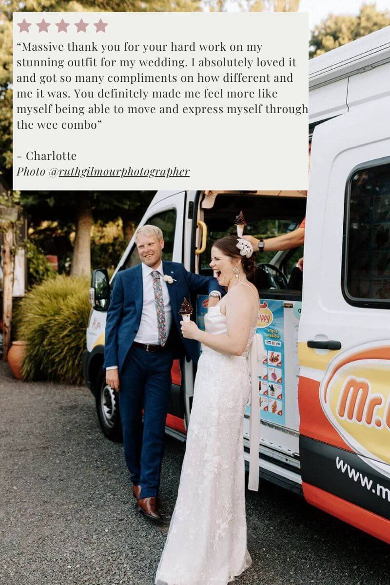"Massive thank you for your hard work on my stunning outfit for my wedding. I absolutely loved it and got so many compliments on how different and me it was. You definitely made me feel more like myself being able to move and express myself through the wee combo. We have some sneak peak photos to share with you of how it turned out"