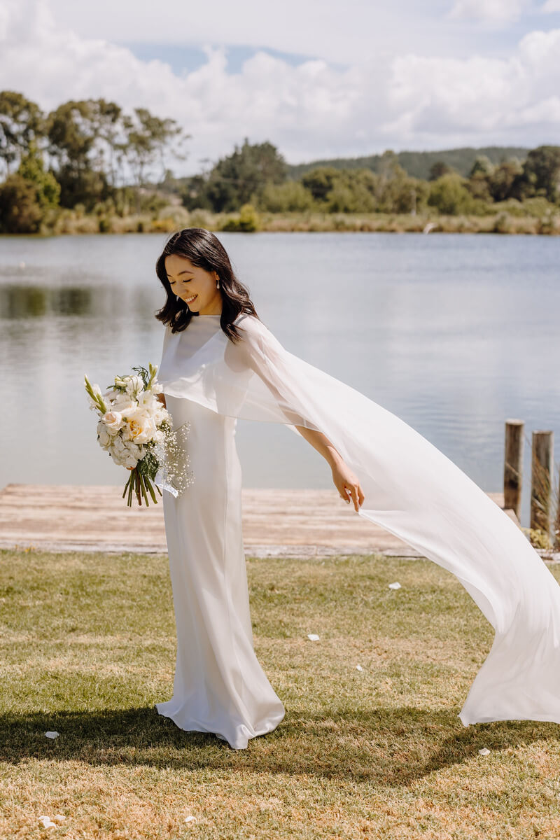 ‘I didn’t want to wear a veil, so I chose the silk bridal cape for the ceremony. It completed my look, and I loved being able to remove it later for a second look.’