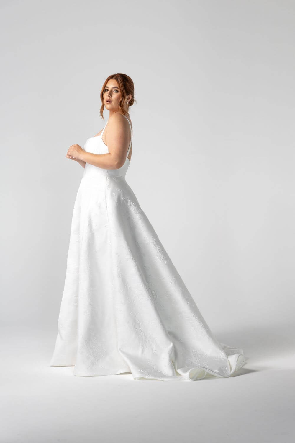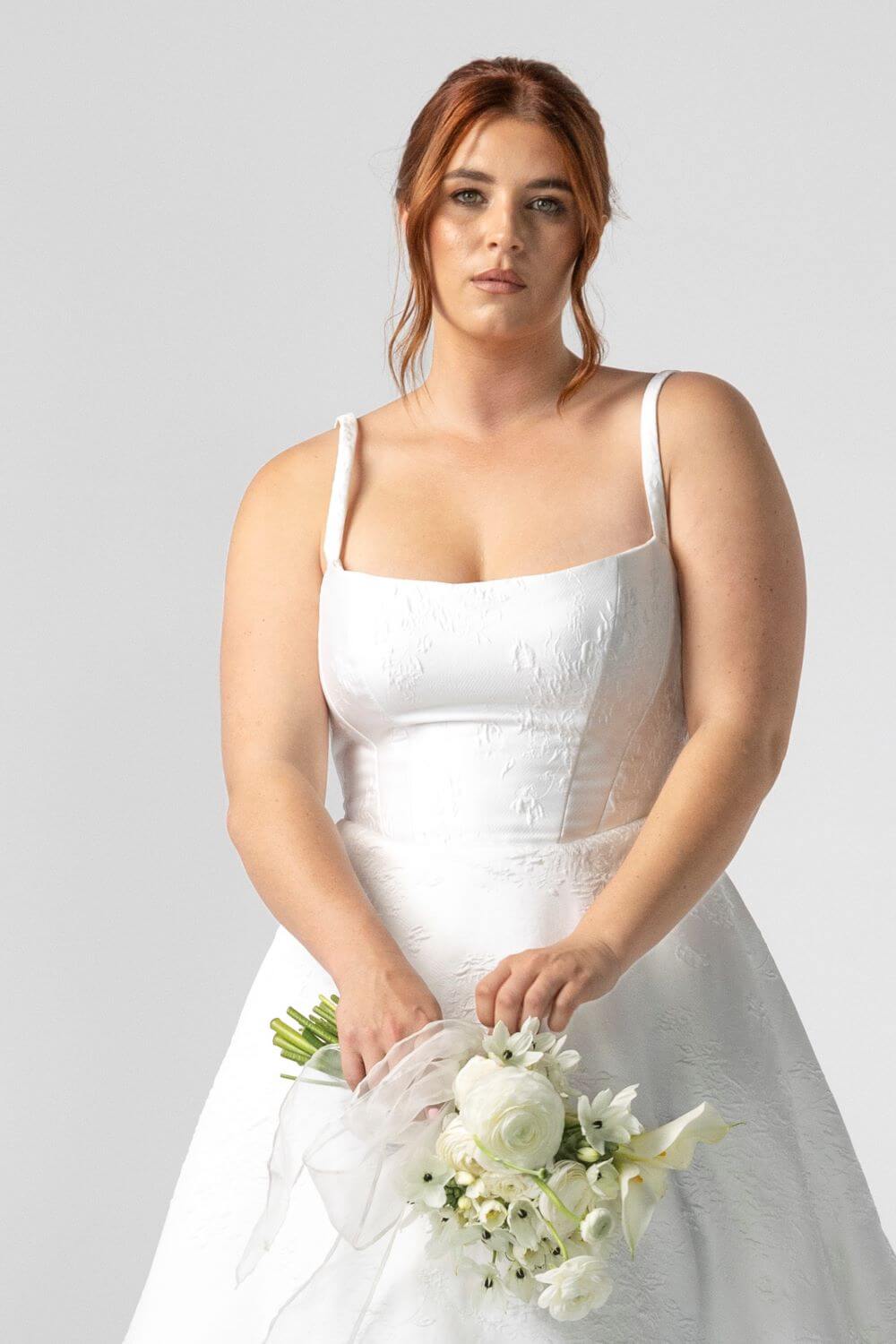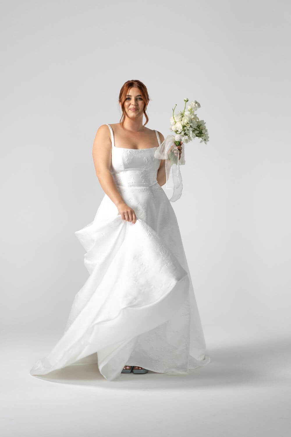 Crafted in luminous floral brocade, the Rita Gown combines clean lines with rich texture and a soft sheen. It features a square neckline, supportive straps, and a structured bodice that flows into a gentle basque waist. A balance of timeless elegance and modern refinement.