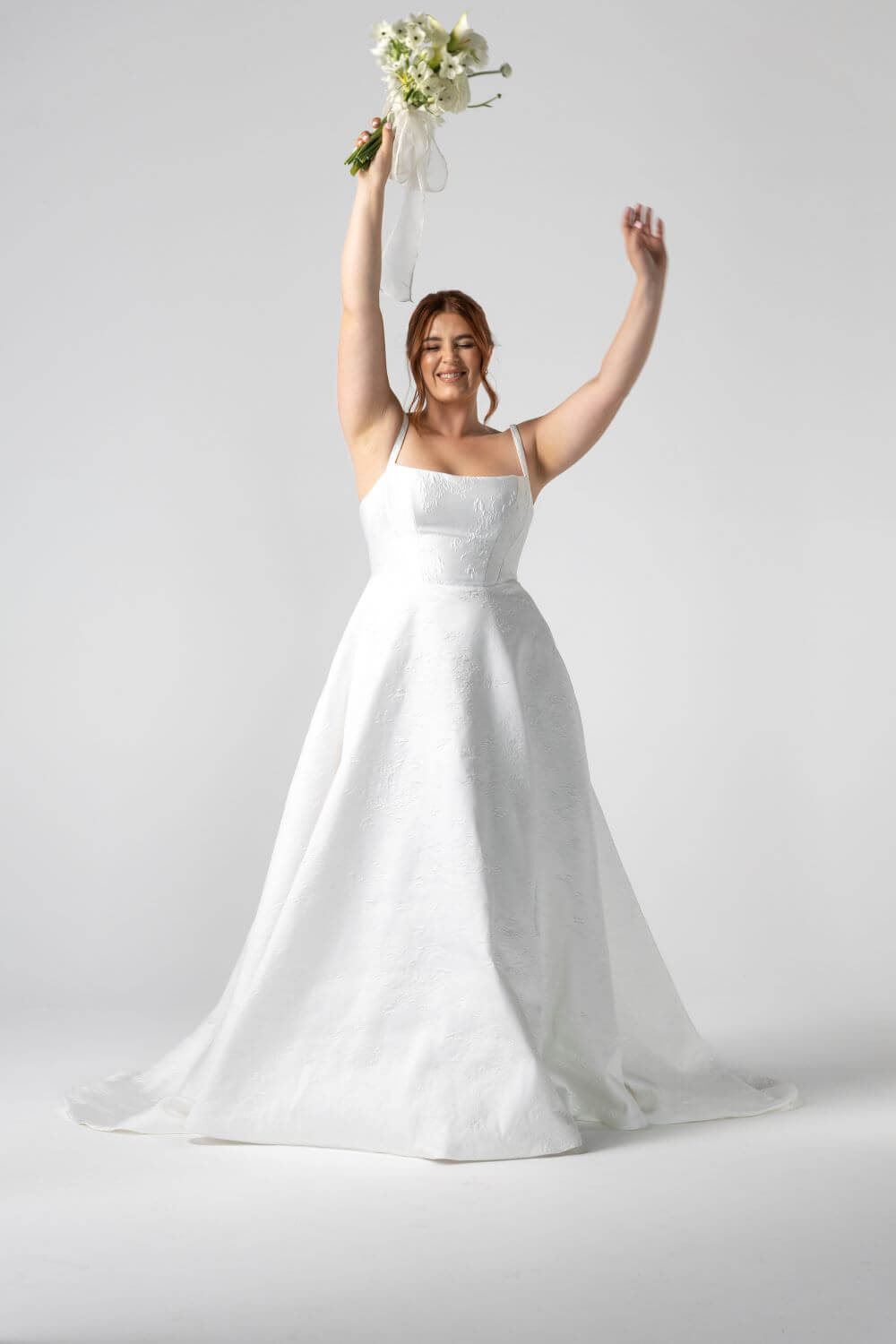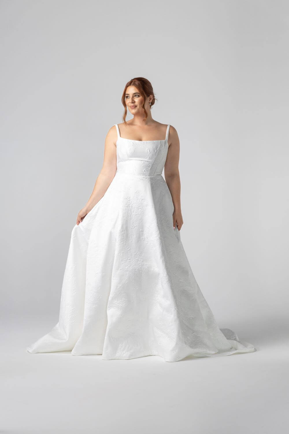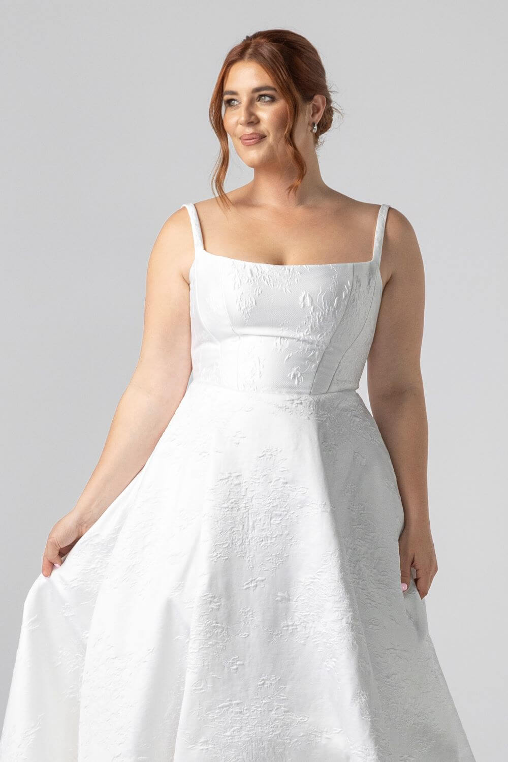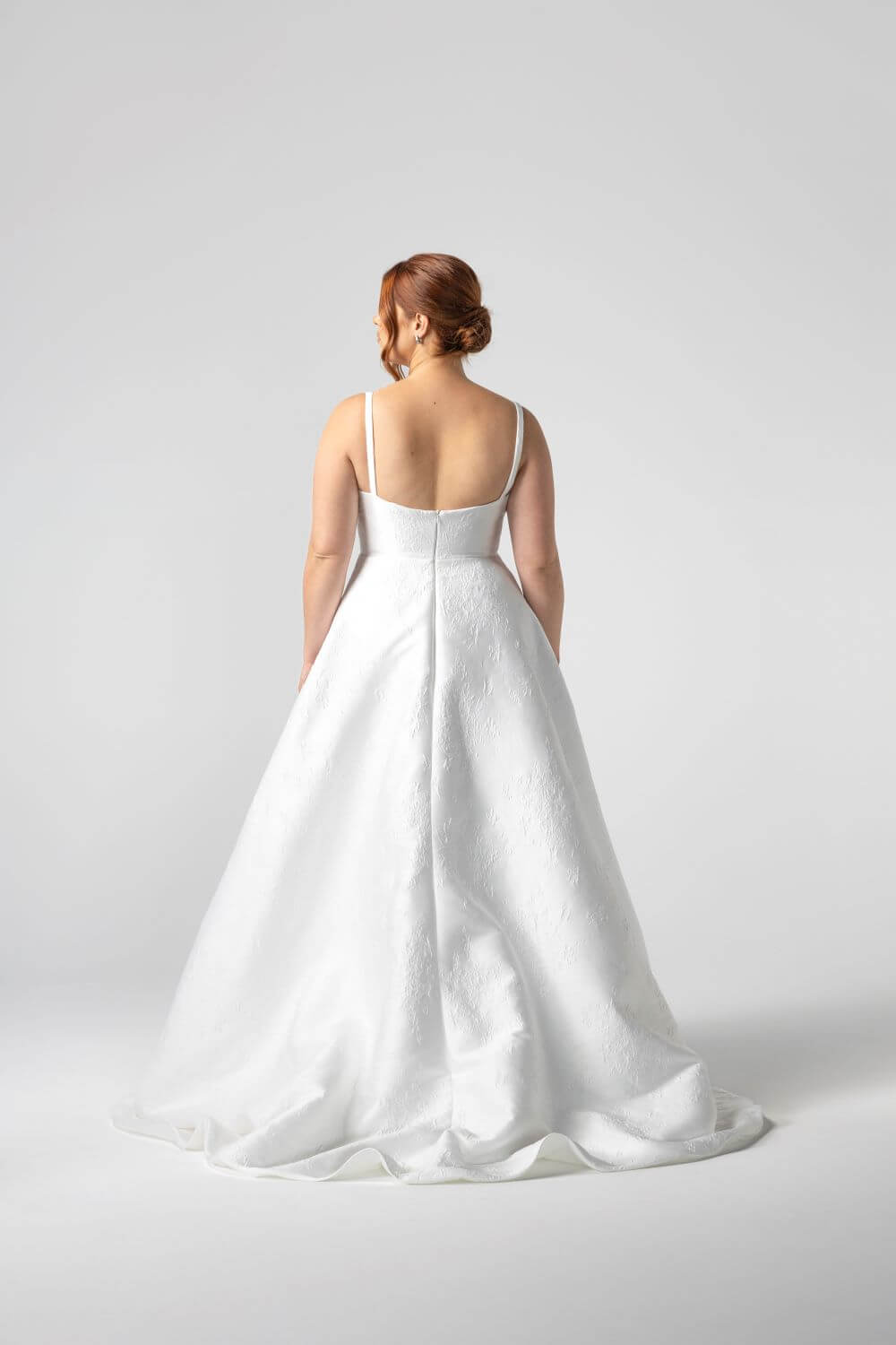 Crafted in luminous floral brocade, the Rita Gown combines clean lines with rich texture and a soft sheen. It features a square neckline, supportive straps, and a structured bodice that flows into a gentle basque waist. A balance of timeless elegance and modern refinement.