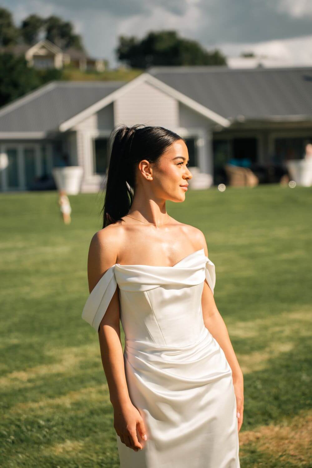 The Riviera gown features a corseted bodice, with draped cowl neckline and a pleated skirt. Made from a medium weight satin, this gown drapes beautifully, with a luxurious look and feel. The structured bodice and pleating creates an hourglass figure without compromising comfort. This gown can be worn strapless or with detachable draped off-shoulder sleeves.