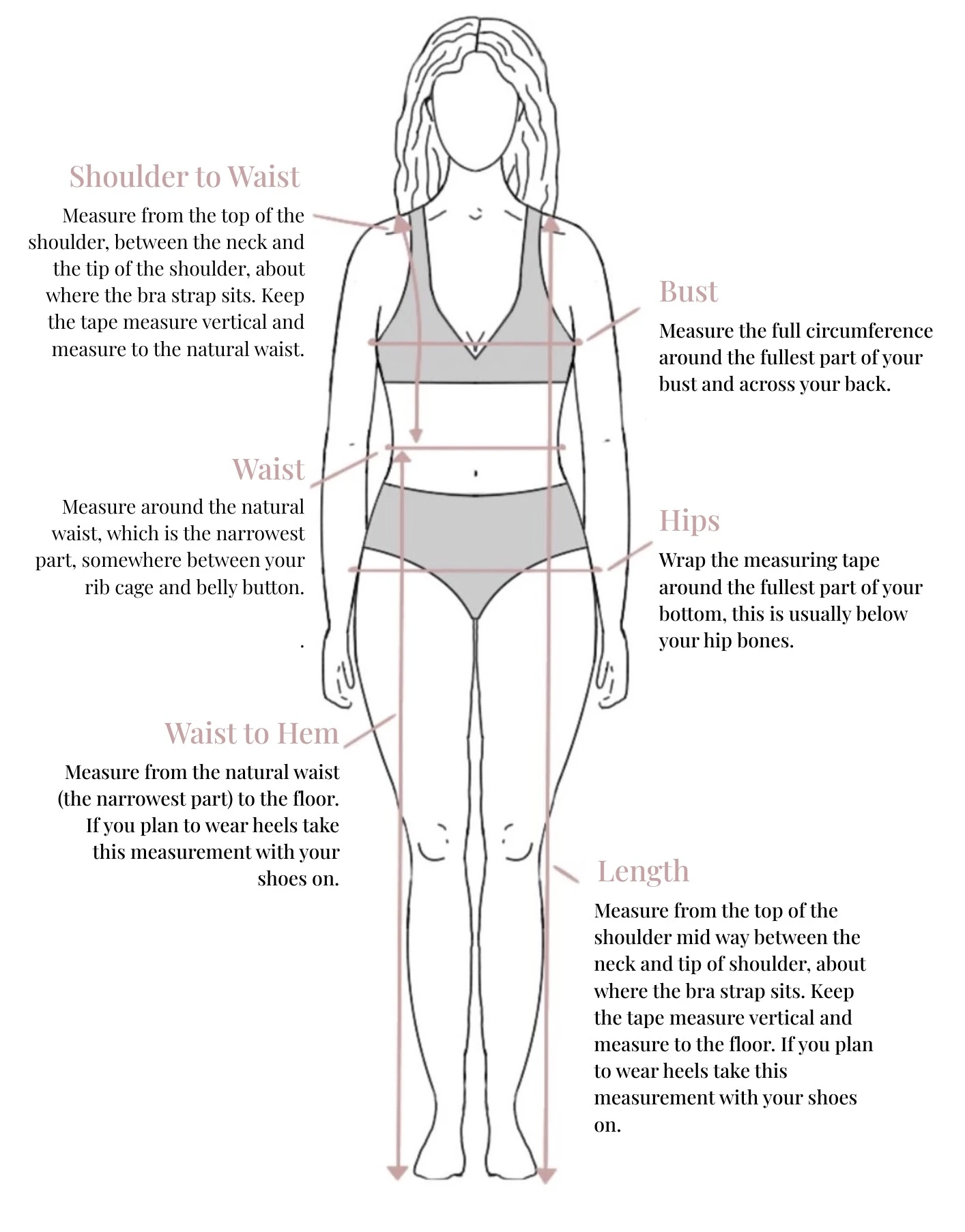 Measure from the top of the shoulder mid way between the neck and tip of shoulder, about where the bra strap sits. Keep the tape measure vertical and measure to the floor. ​If you plan to wear heels take this measurement with your shoes on