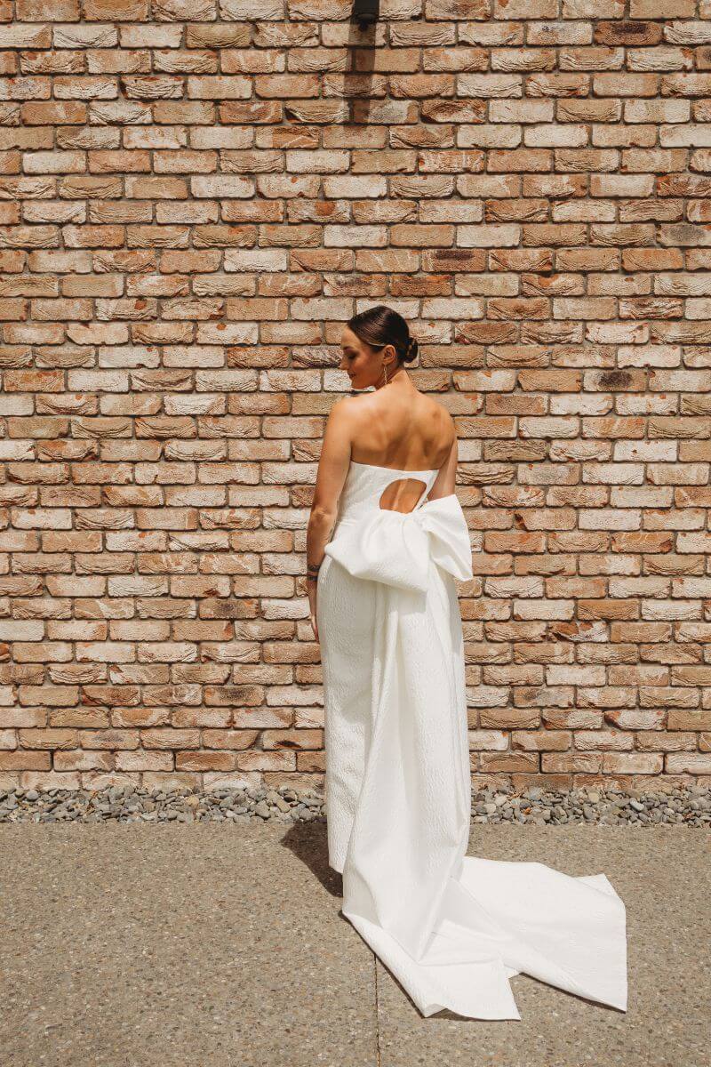 Graceful and chic, with a sleek straight cut skirt, back split and modern curved high neck. The detachable statement bow doubles as a train. Made from ivory jacquard, this dress is light weight. For support and structure the strapless bodice has internal boning and cups