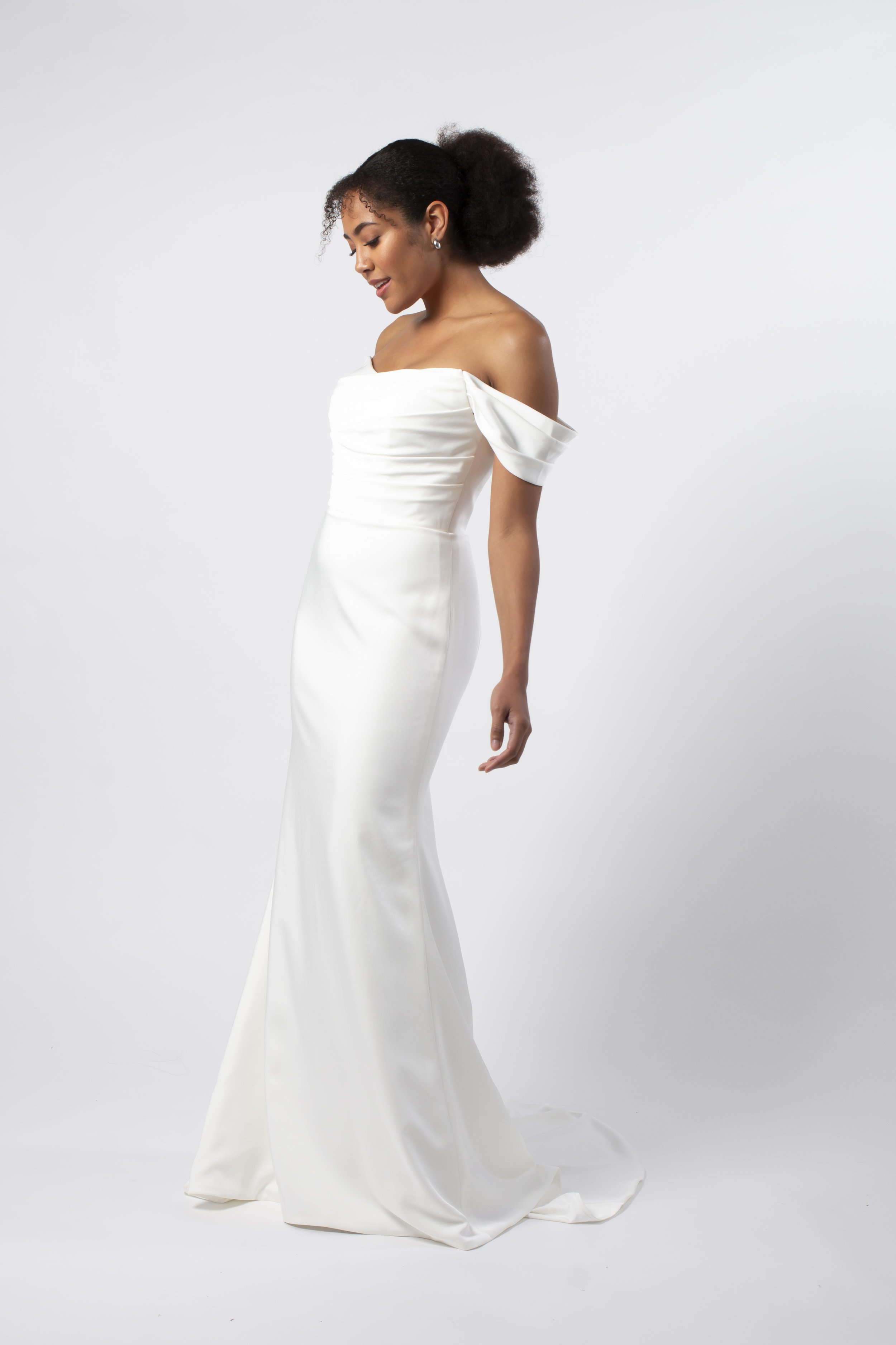 The Celeste Gown: A minimalist satin dress with a flattering A-line silhouette, perfect for the understated bride.
