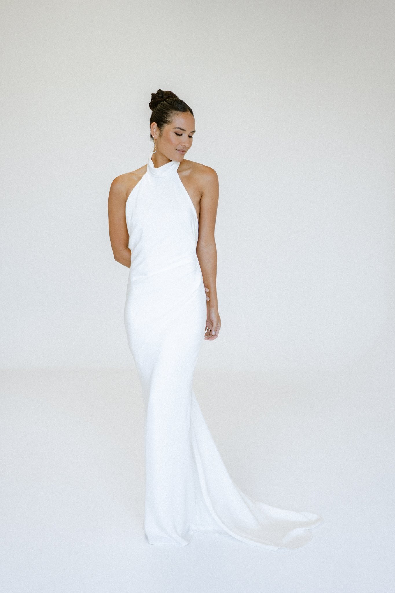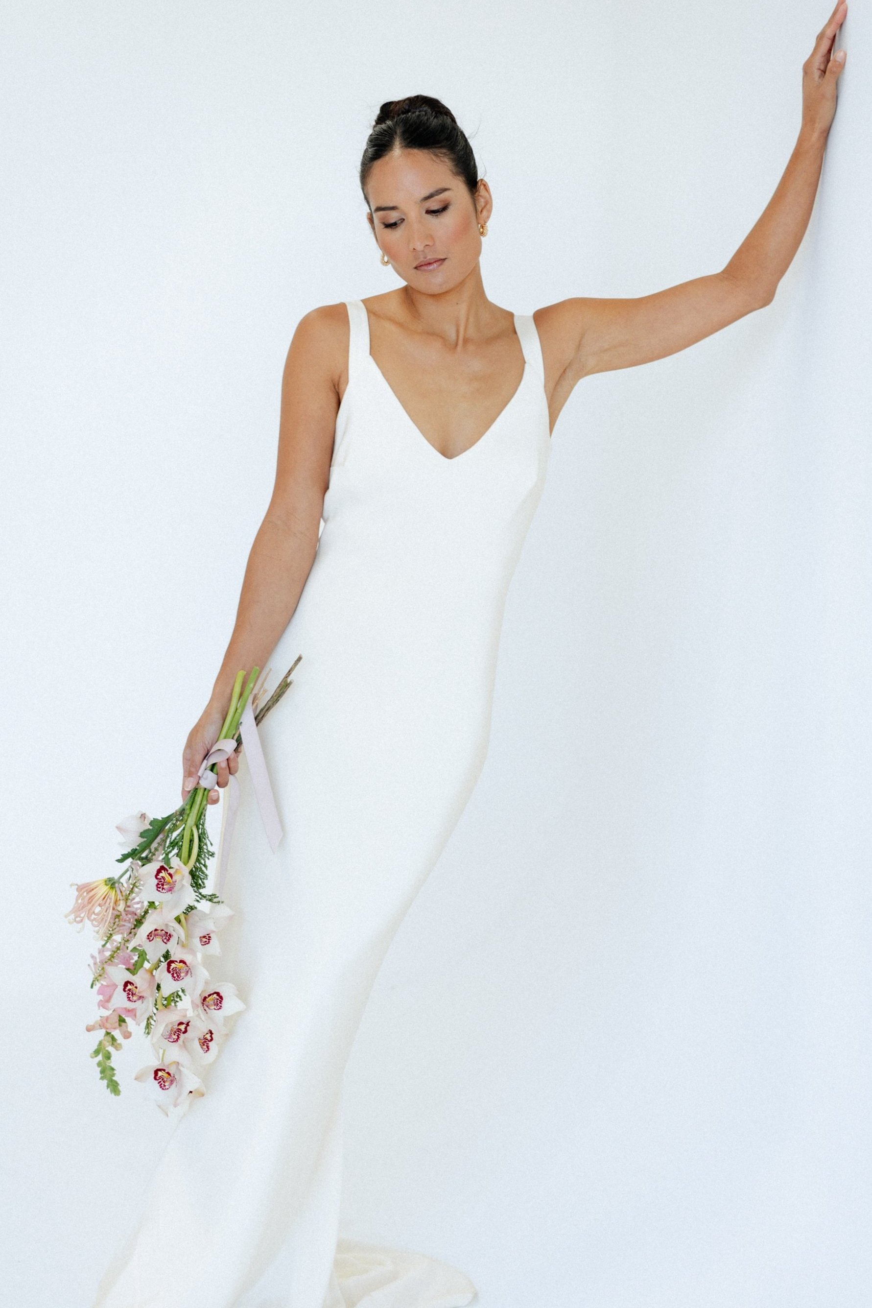 The Lucy Gown: An elegant minimal gown in the most luxurious heavy silk crepe with a low v back and small train, ideal for a modern yet classic look.