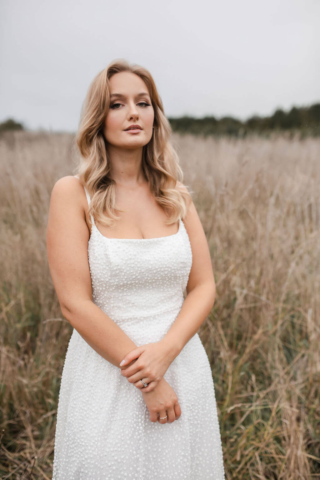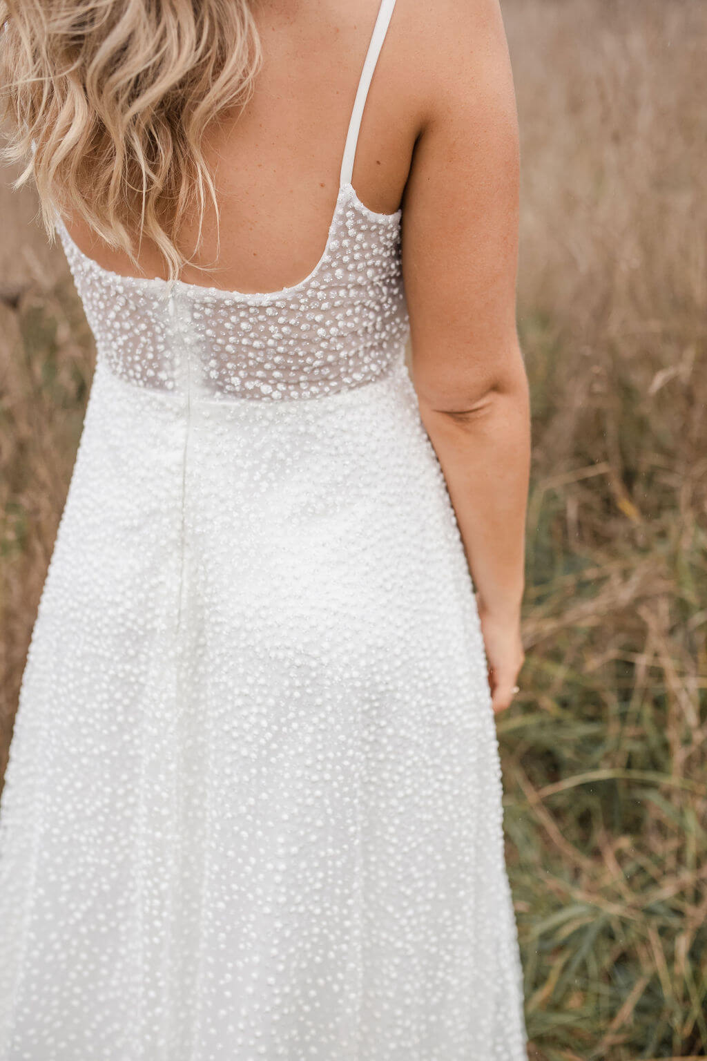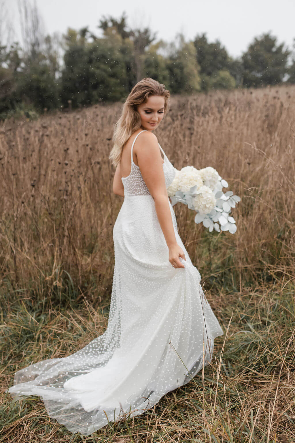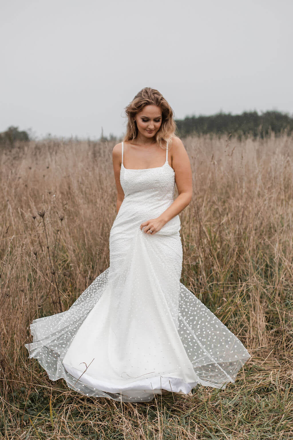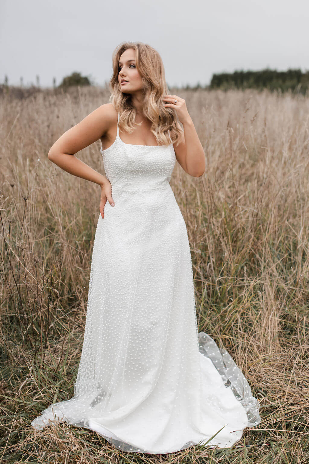 The Stella Gown is a soft and effortless bridal look made from lightweight dotted tulle. It features a simple square neckline, thin straps, and a gently fitted bodice that flows into a relaxed A-line skirt. The dotted texture adds a touch of sweetness, while the small train gives the gown a classic finish. Perfect for brides wanting something easy, pretty, and romantic.