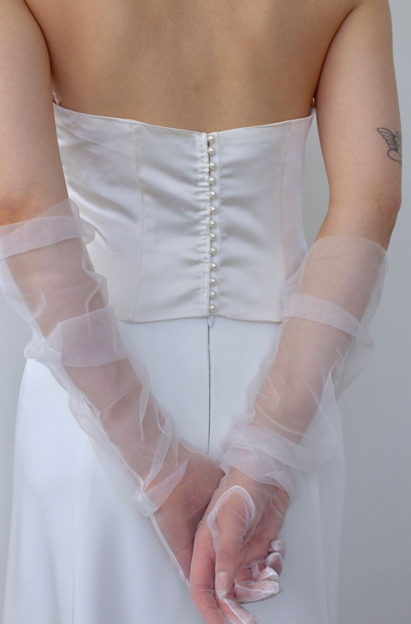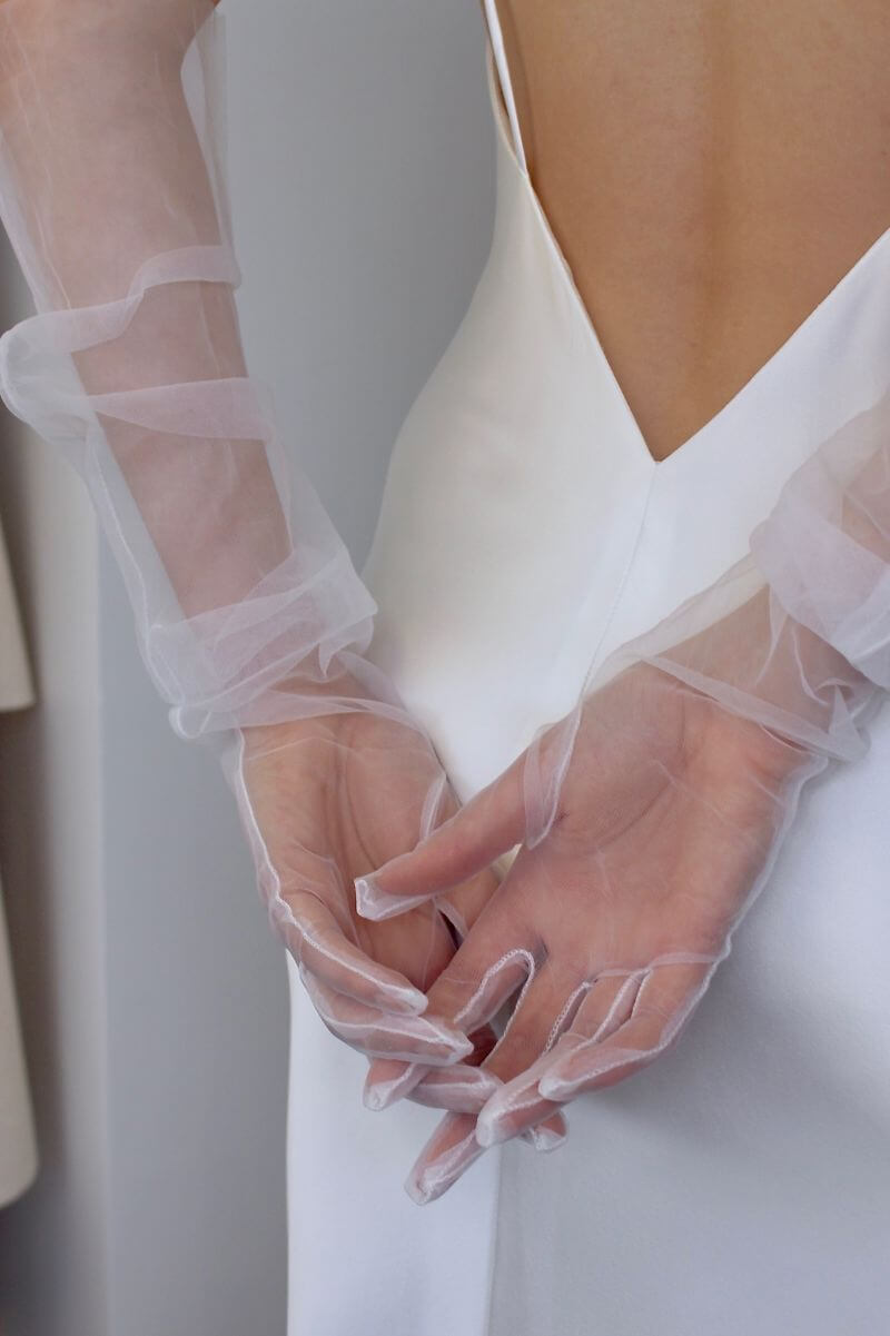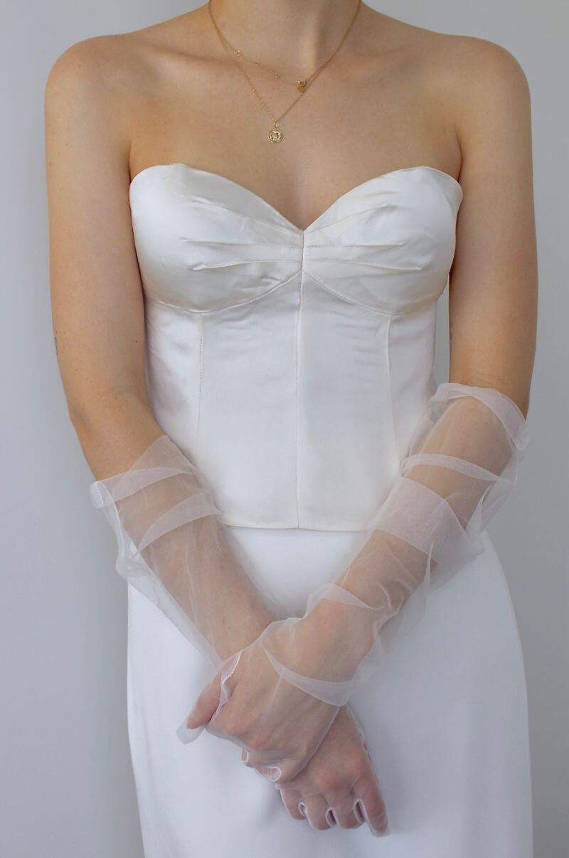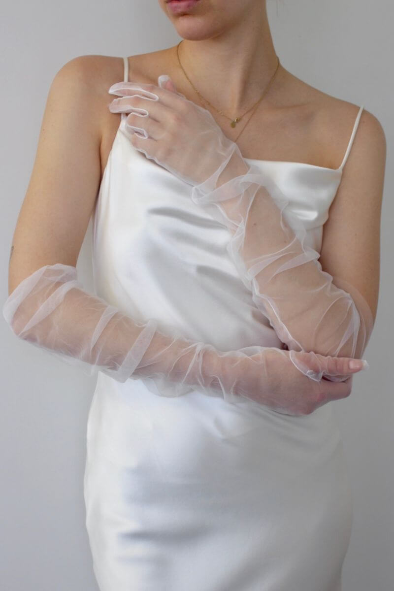 Off-white Tulle Bridal Gloves. These measure 54cm from the tip of the middle finger to the top edge.