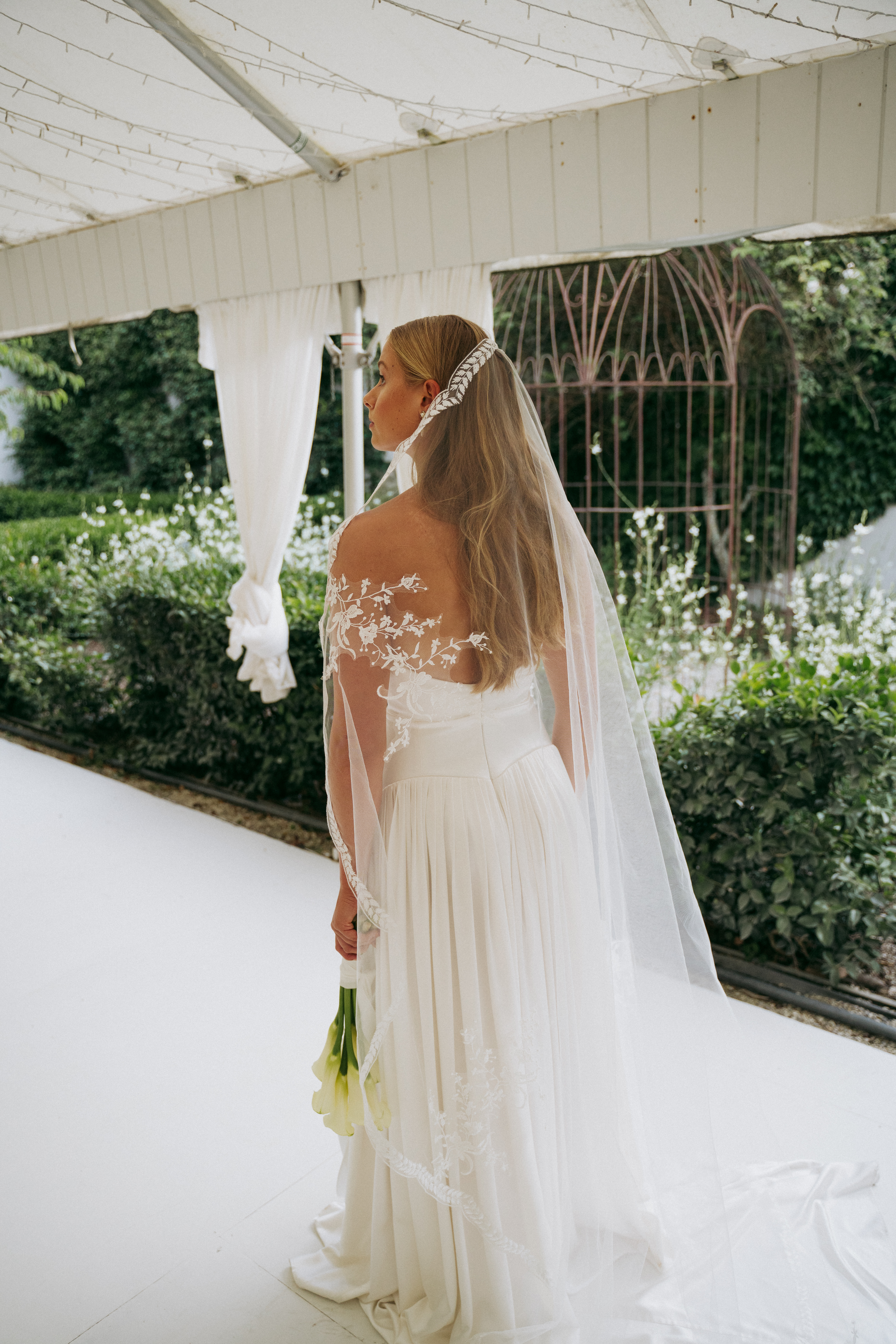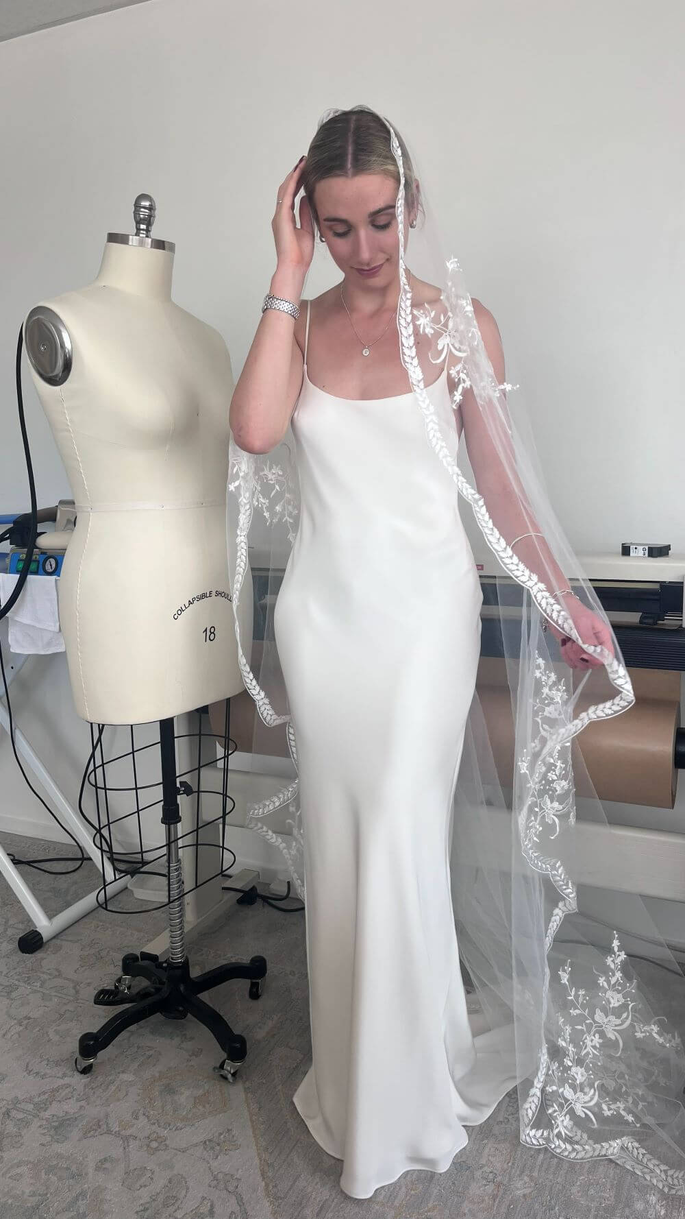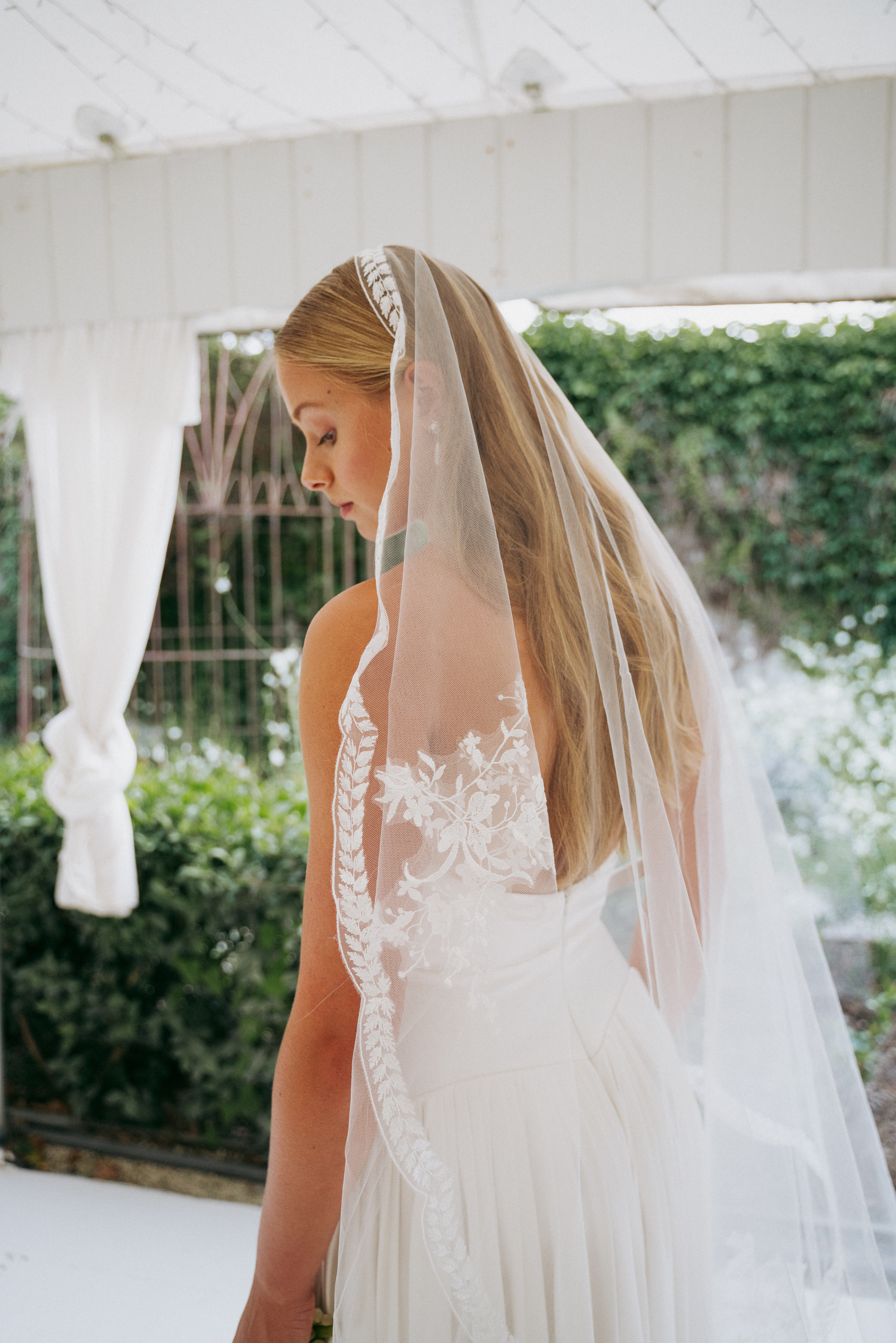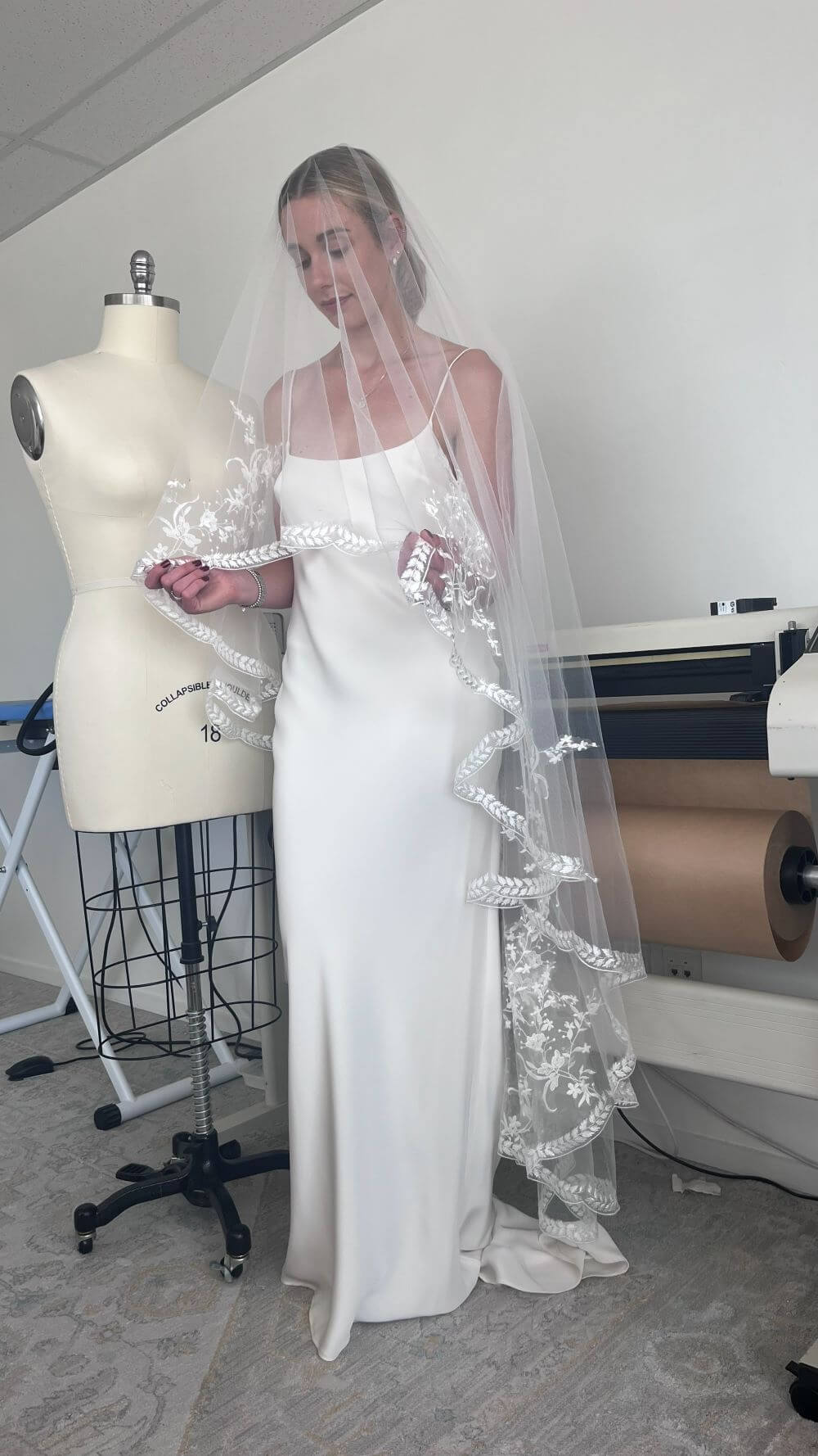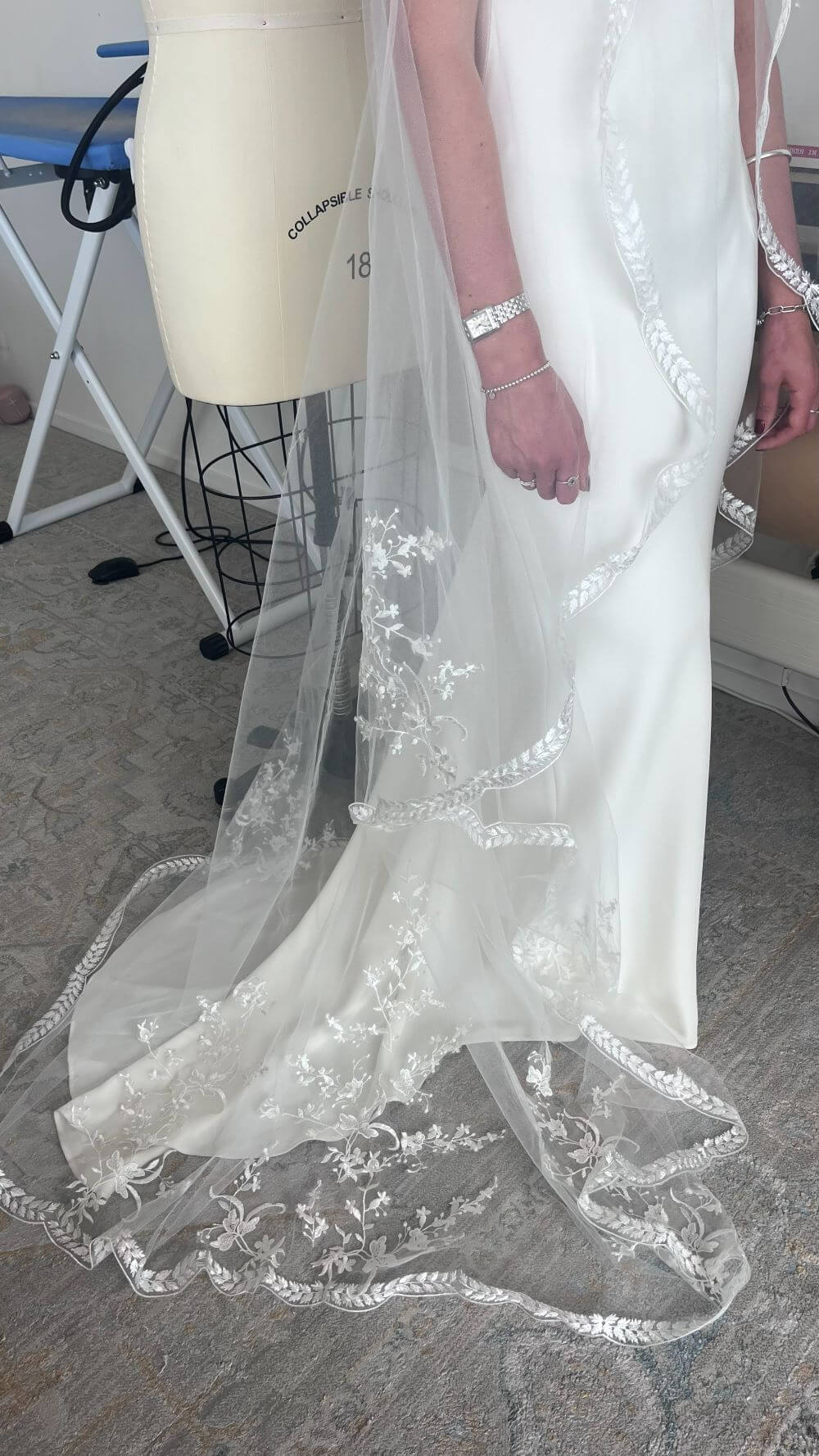 Structured off-white tulle veil with leaf lace edge and floral appliqués around the outer layer. The hair comb can be placed at a custom length to wear as a single-layer veil or as a blusher over the face. Made from structured tulle with lace trim, and can be styled as a single layer or layered as a blusher.