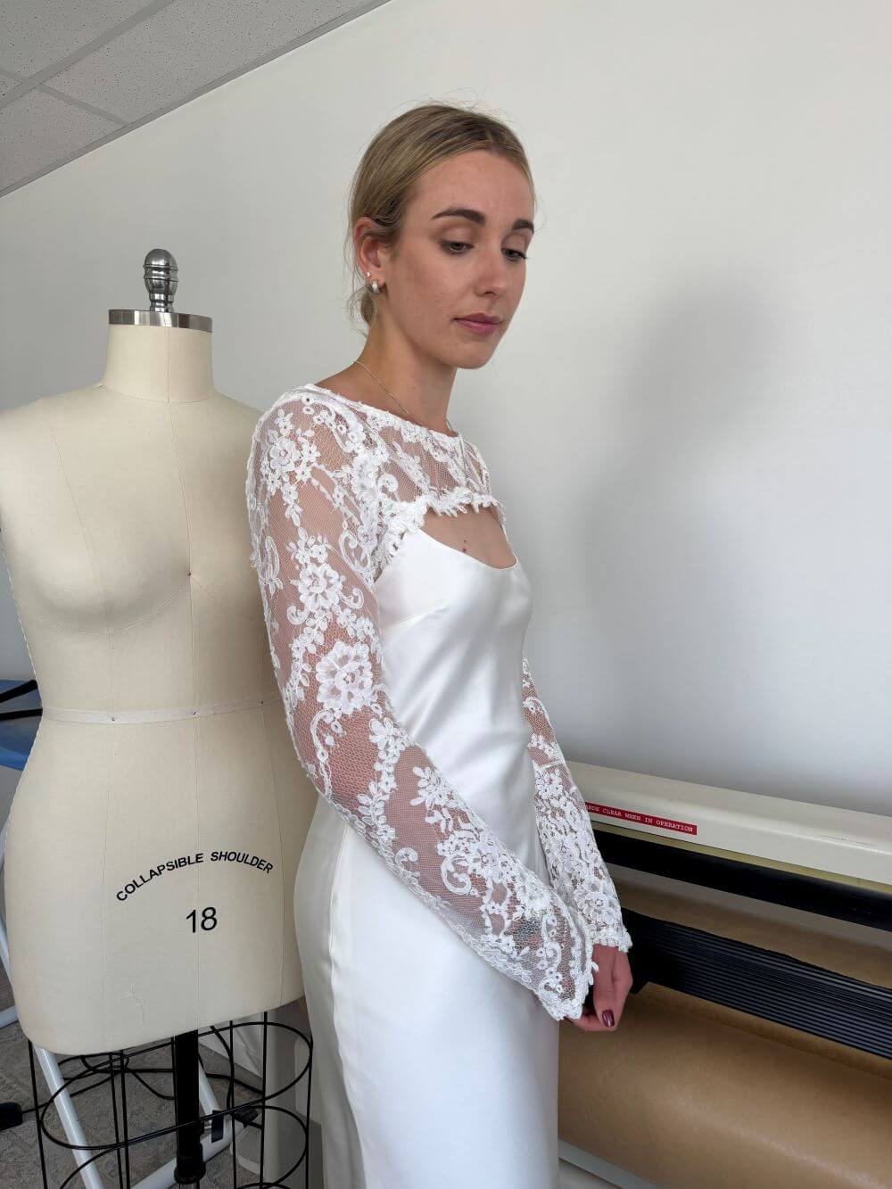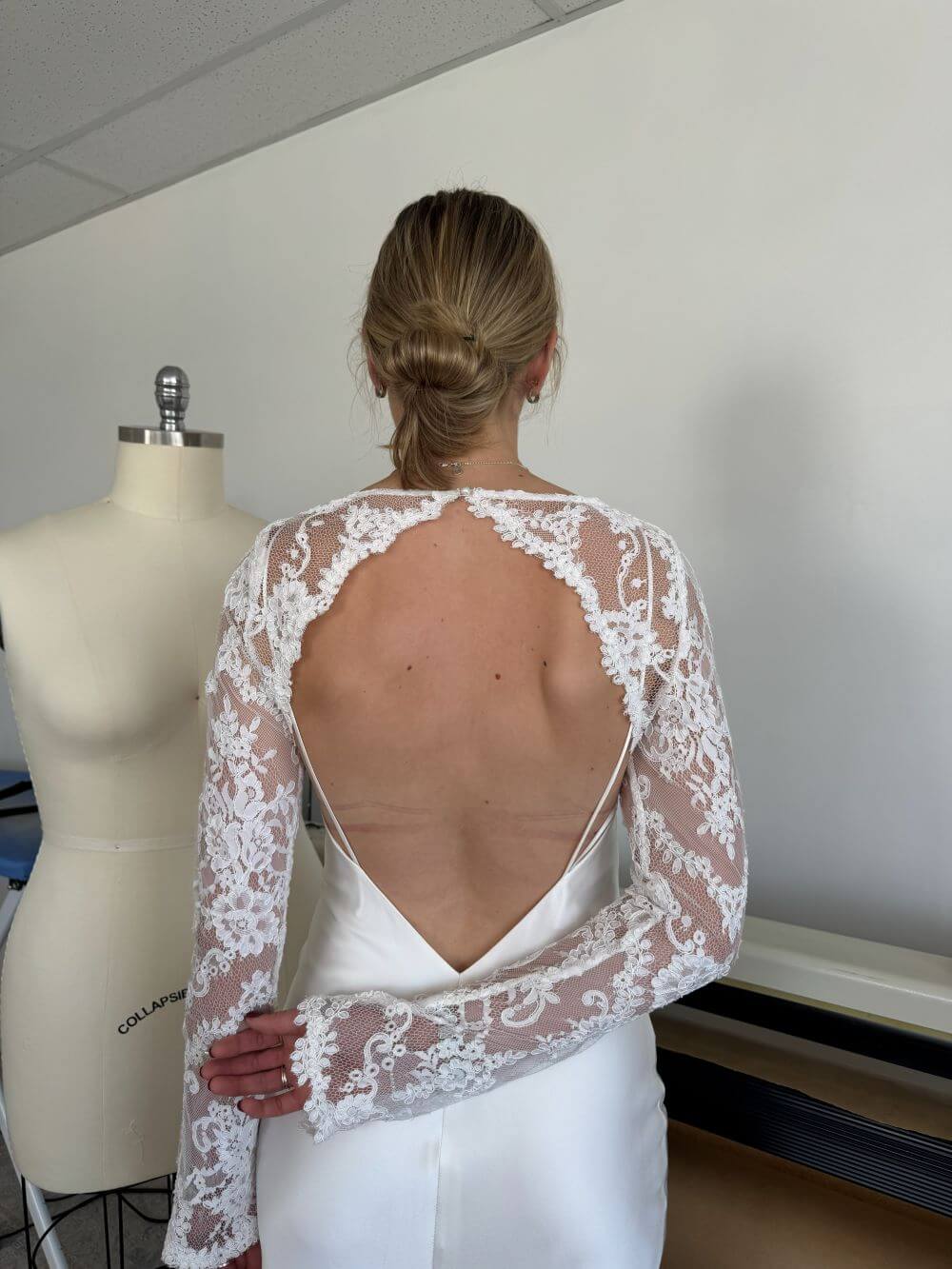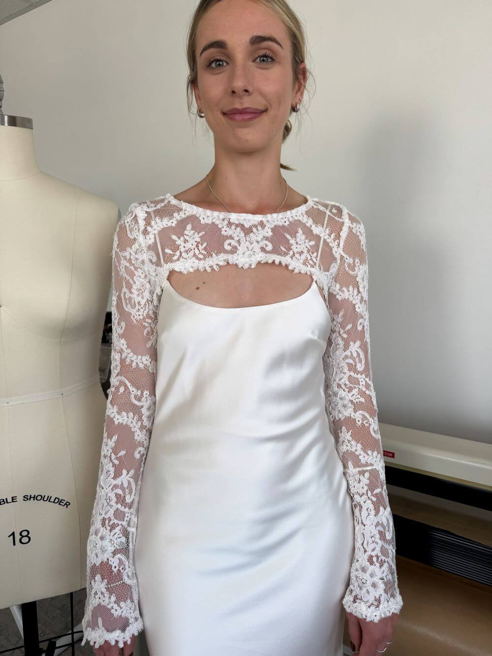 A sample of our new to the collection, the Yasmin Top is a delicate lace bridal layer. Designed with subtly flared sleeves that extend past the wrist and finish in a scalloped edge, it adds soft texture and romance to any look. These sleeves are stunning when paired with both structured gowns and floaty silhouettes.